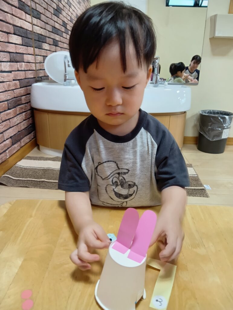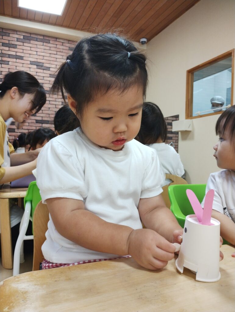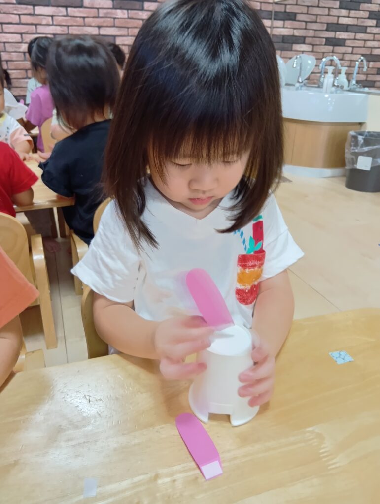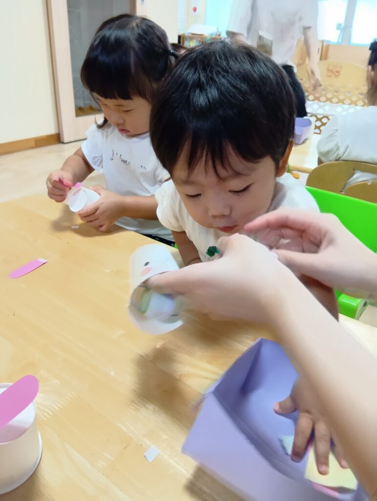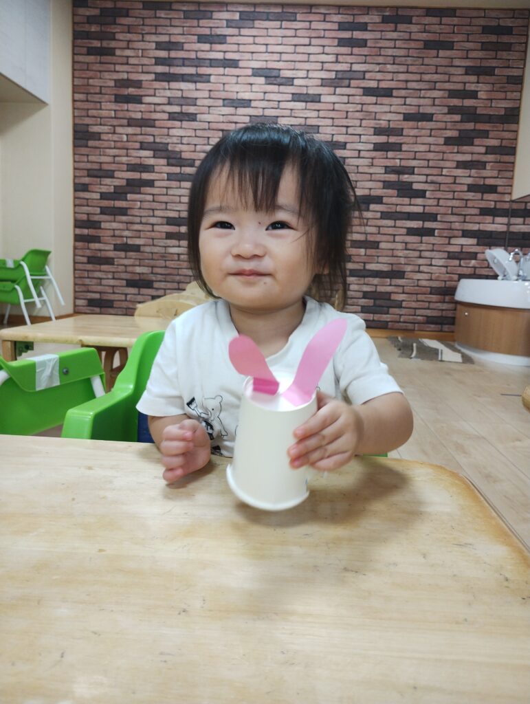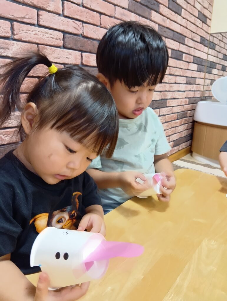 そしてお月見にちなんでうさぎの制作もしましたよ🐇紙コップに耳や目、鼻などを自分でつける子どもたち。