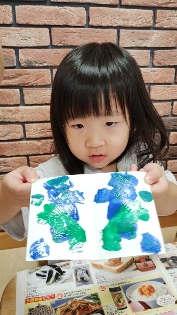 白い画用紙の半分に絵の具を塗り折り曲げてぺたっとつけます。開くと反対側にも絵の具が付いてとっても綺麗な柄が付きました✨️