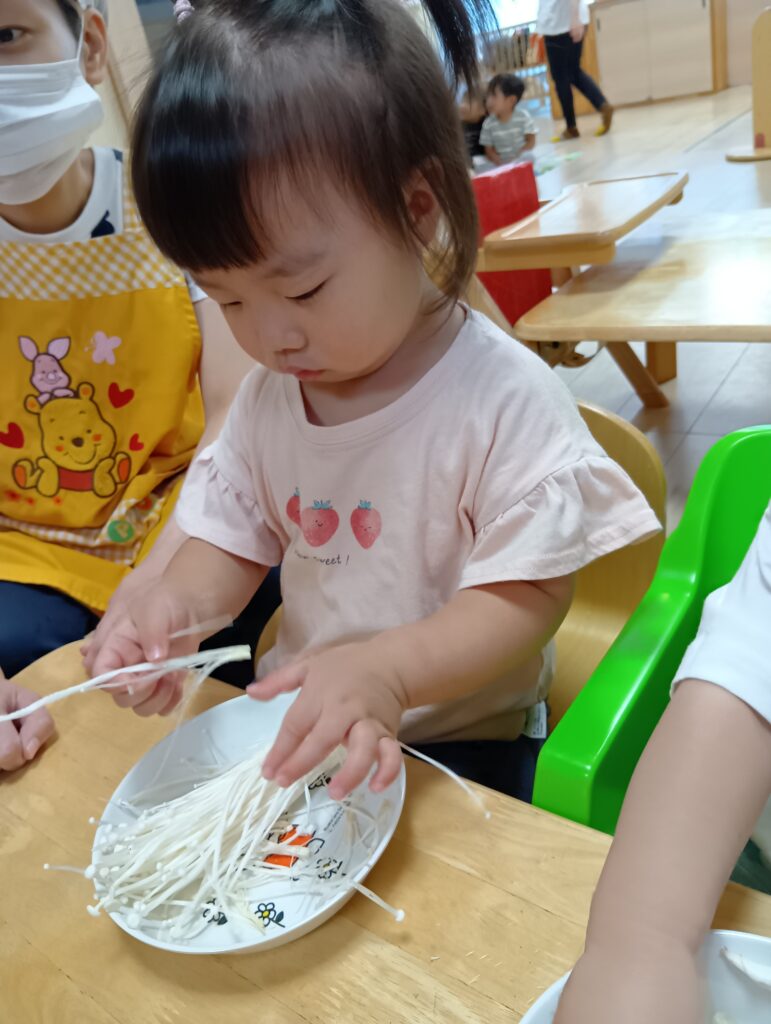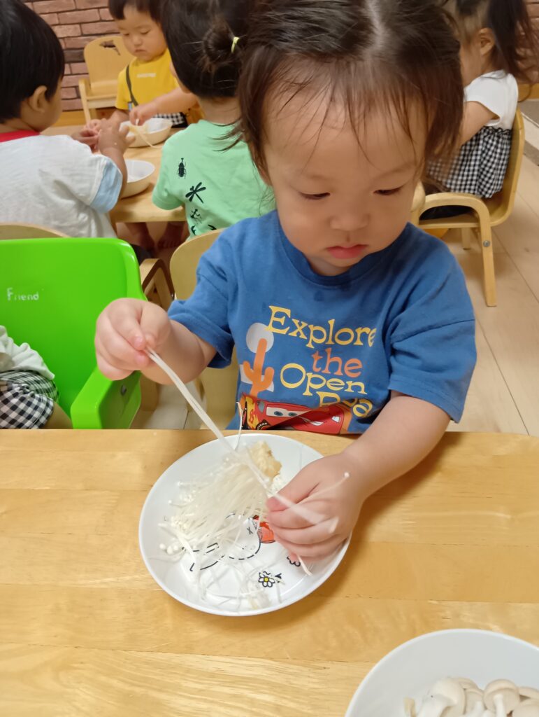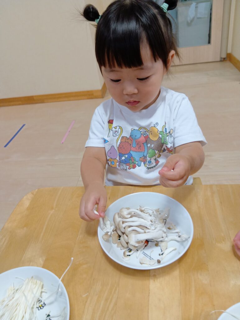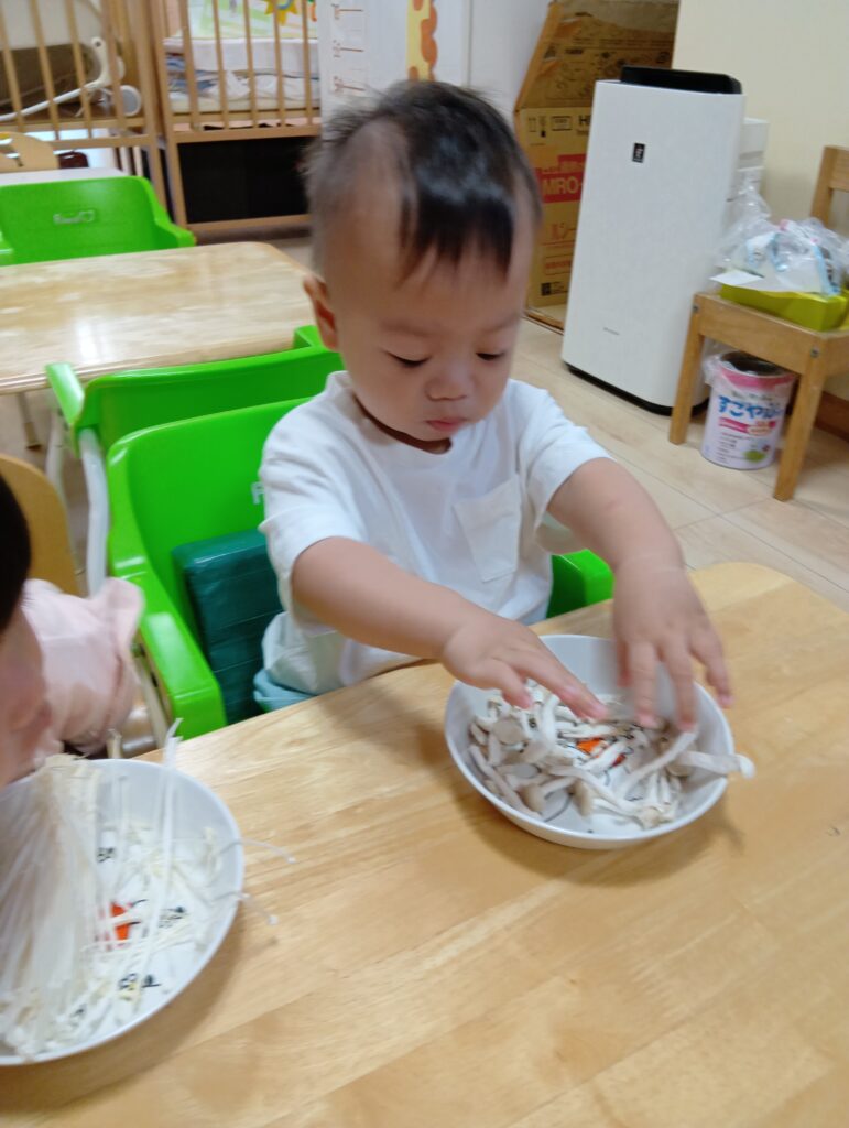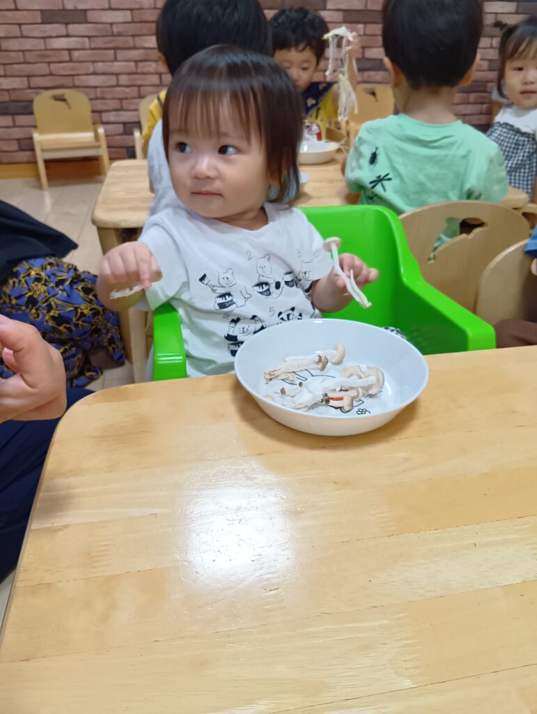 今日は0、1歳児さんは食育をしました。えのきとしめじが入ったお皿をお給食の先生が持ってくると「うわぁ~」と大喜びしてました☺️✨️