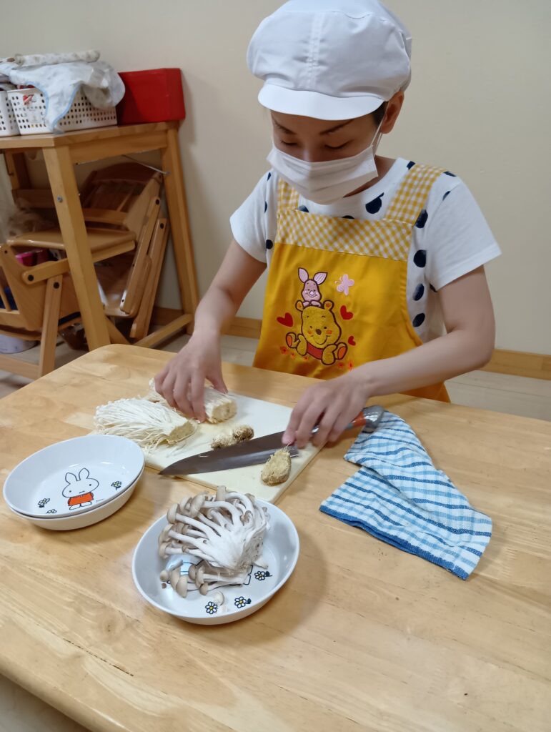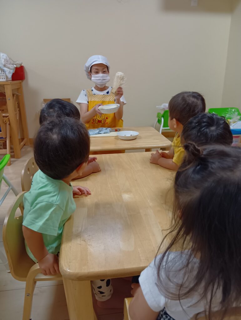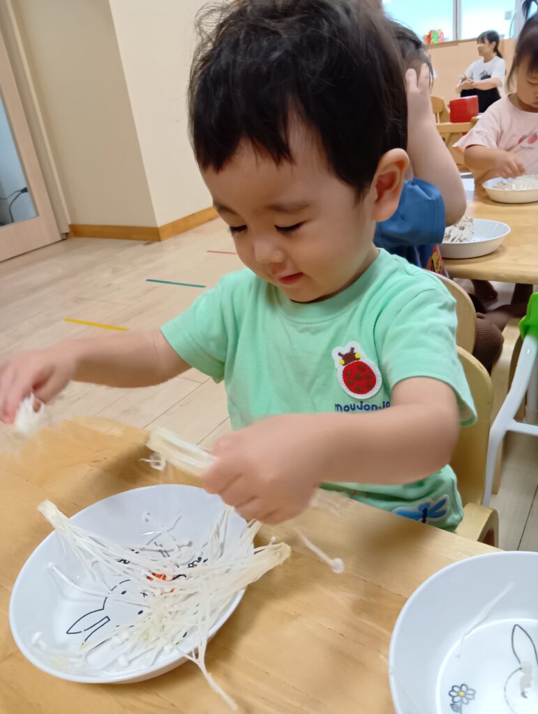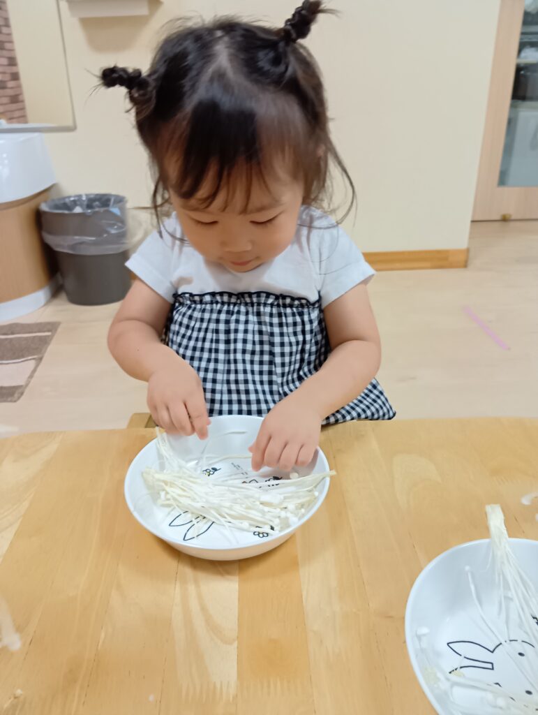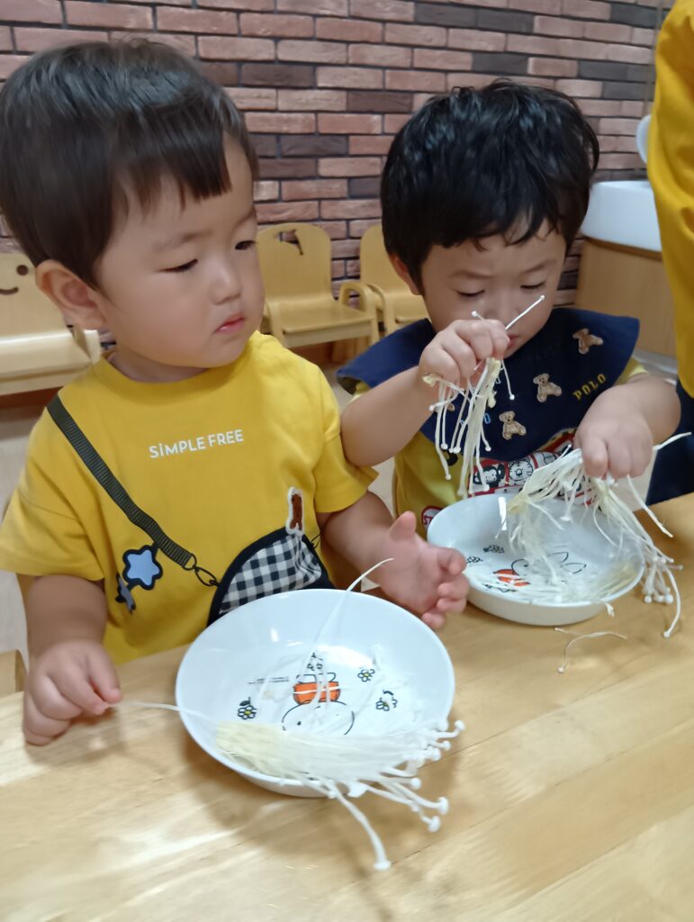 今日は0、1歳児さんは食育をしました。えのきとしめじが入ったお皿をお給食の先生が持ってくると「うわぁ~」と大喜びしてました☺️✨️