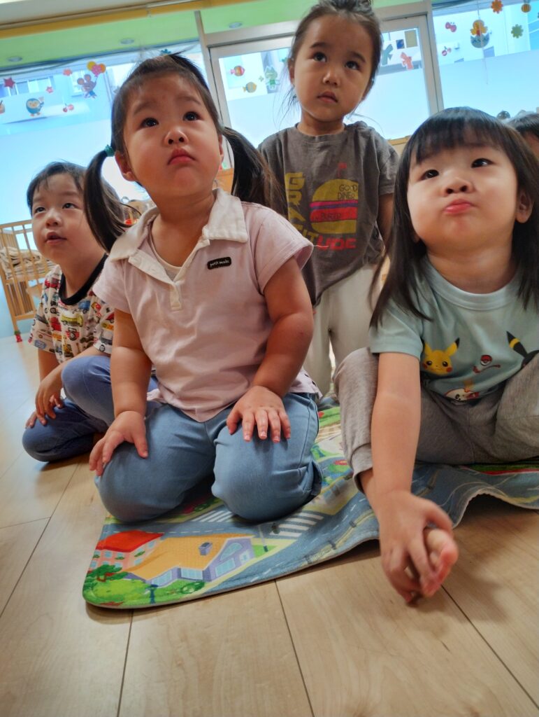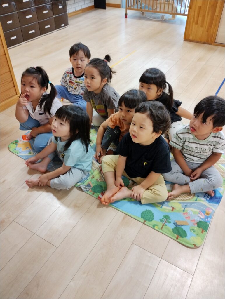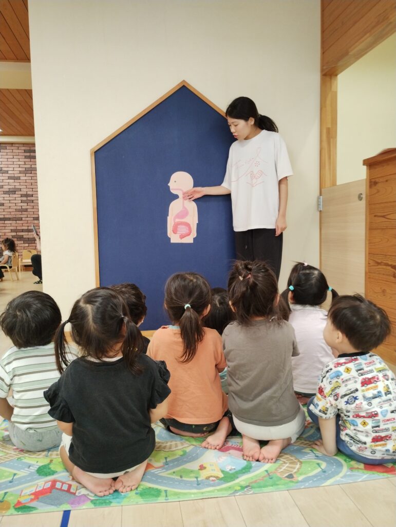 2歳児さんは身体の仕組みの話しをしました。人体の絵が出てくるとみんな興味津々で集中して話しを聞いていました!