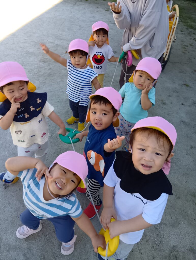「うんとこしょ、どっこいしょ!」「まだまだイモは抜けません。」なかなか抜けないさつまいも。自分たちで呼びかけ、お友達に手伝ってもらいました😊✨