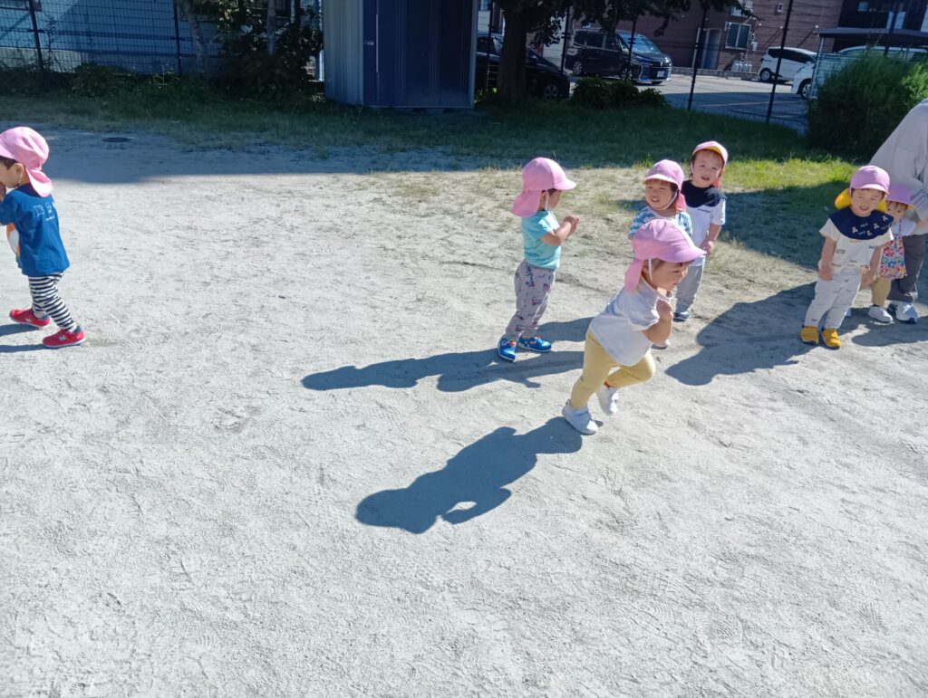 0歳児さんと1歳児さんは公園へお散歩へ。途中、秋風も吹いてきました🍂広場ではかけっこをしましたよ🤩運動会の時よりも、フォームもタイミングもバッチリになってきた子どもたちです🎵
