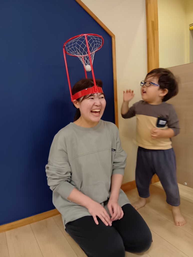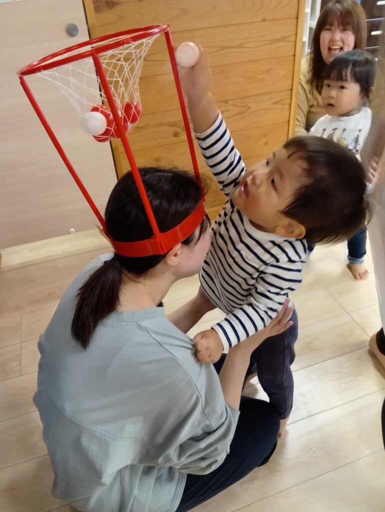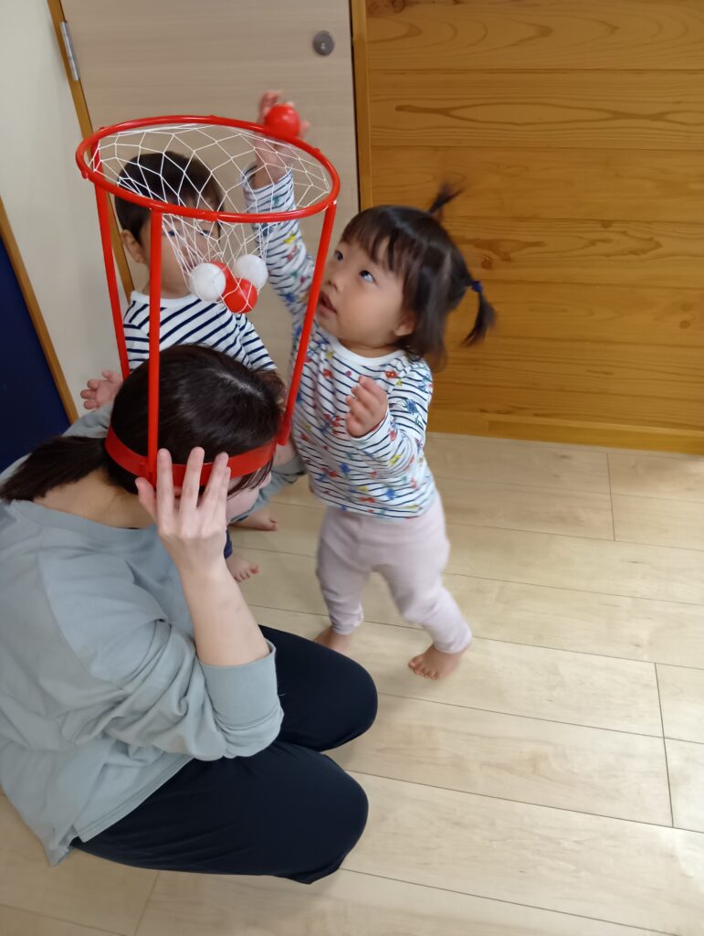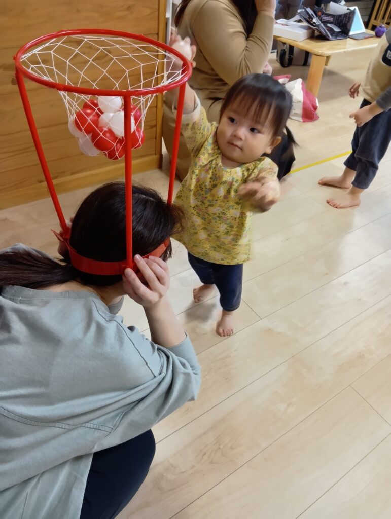 玉入れでは保育者がゴールになりました🎵いつもとは違う姿の保育者にみんな目を丸くしていました👀✨ゴールに向かって「えいっ!」と一生懸命です🤩