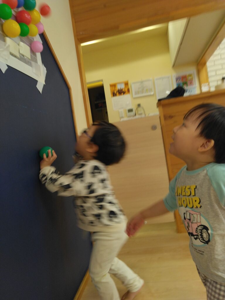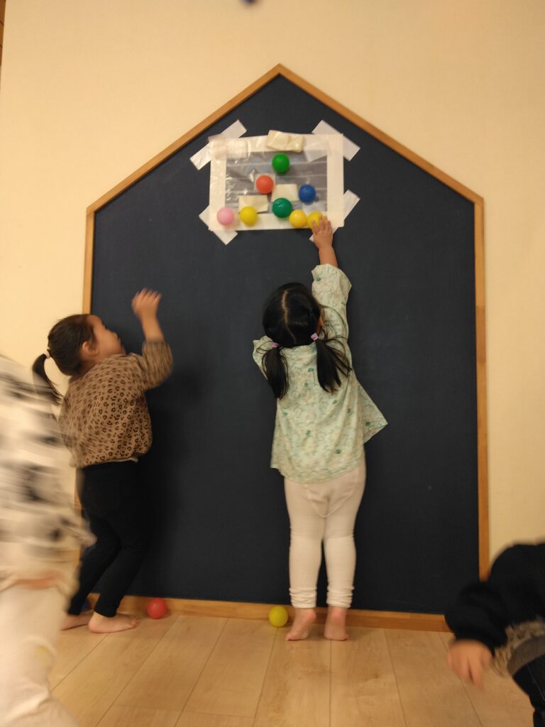 こちらは壁に貼ってある的コーナー。一生懸命付けようと、たくさんジャンプをしていた子どもたちです⭐