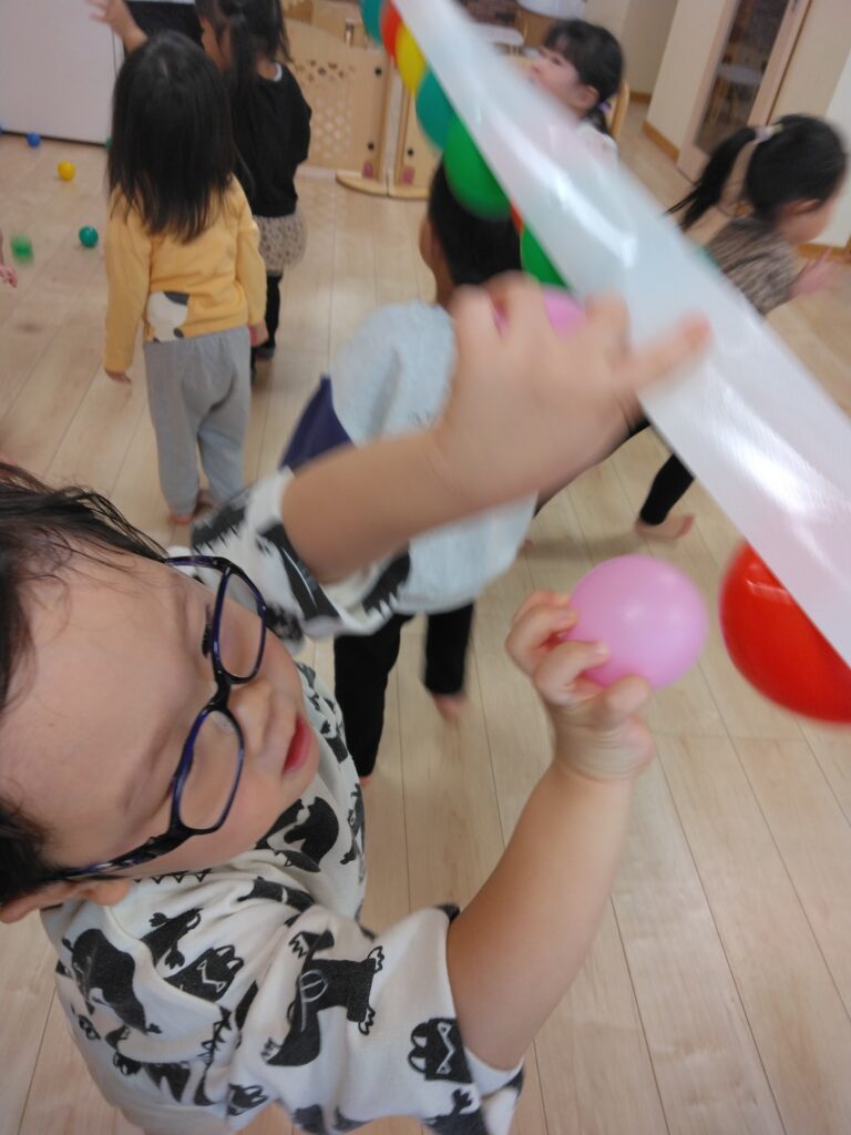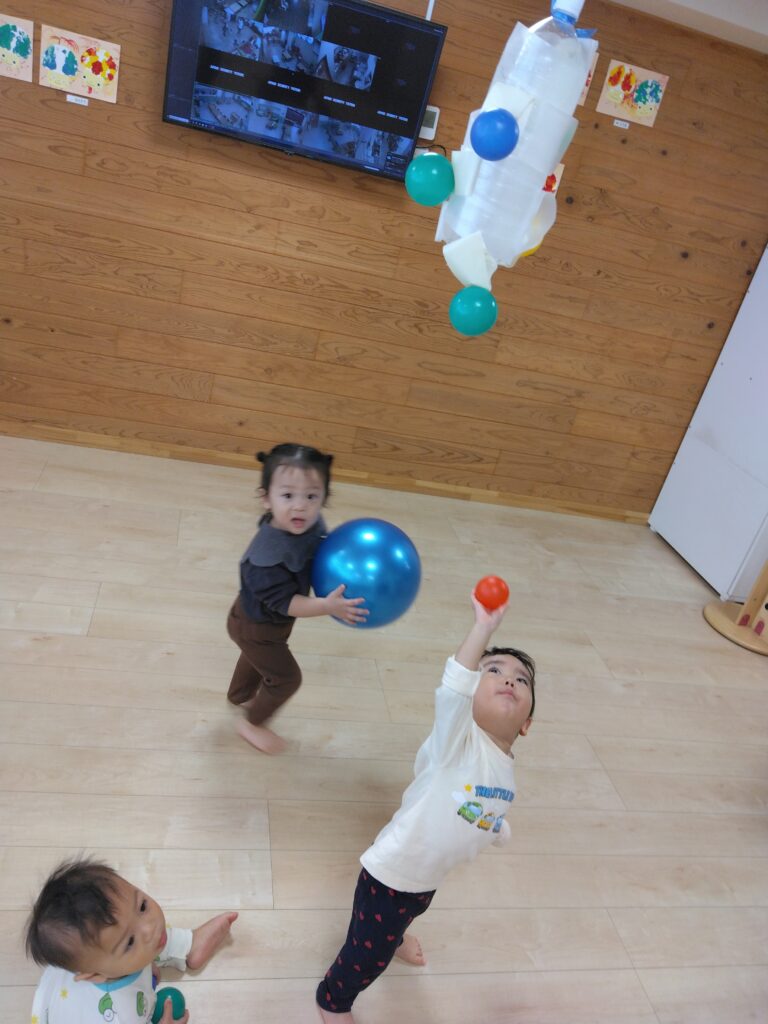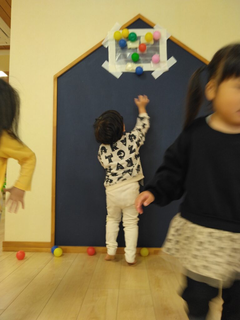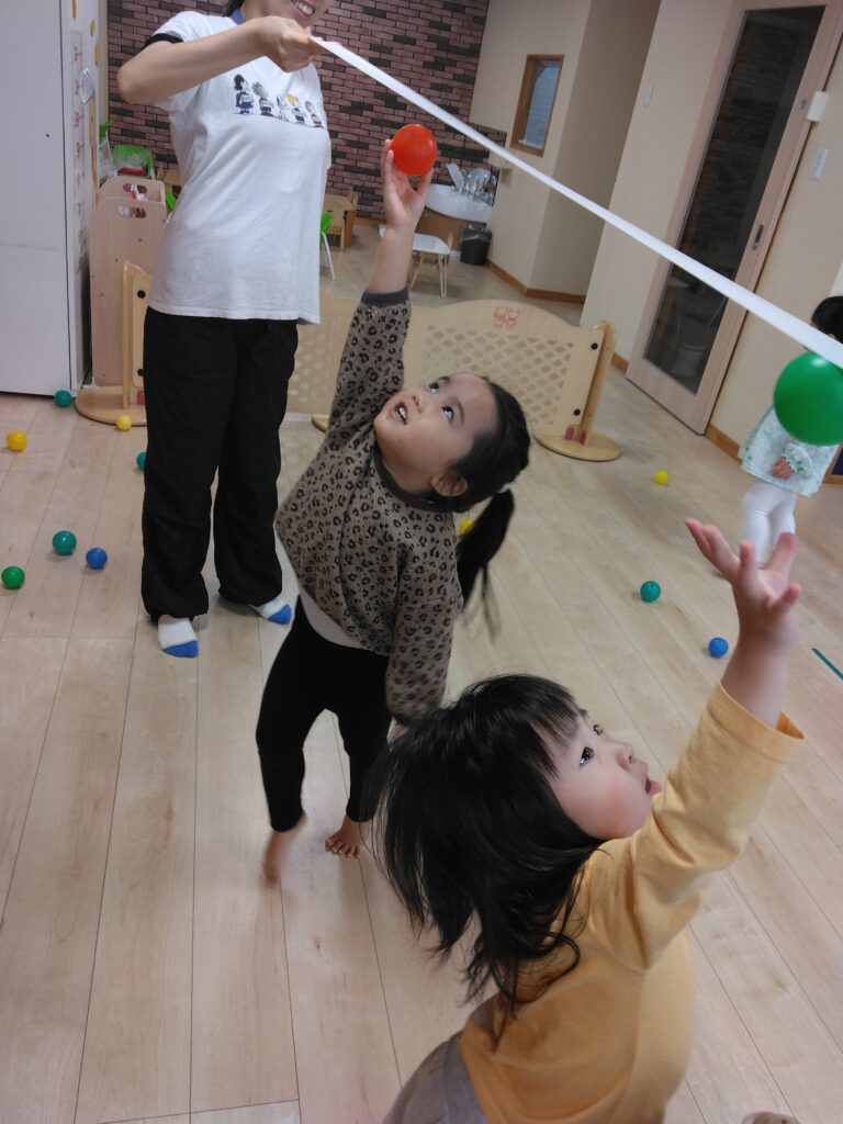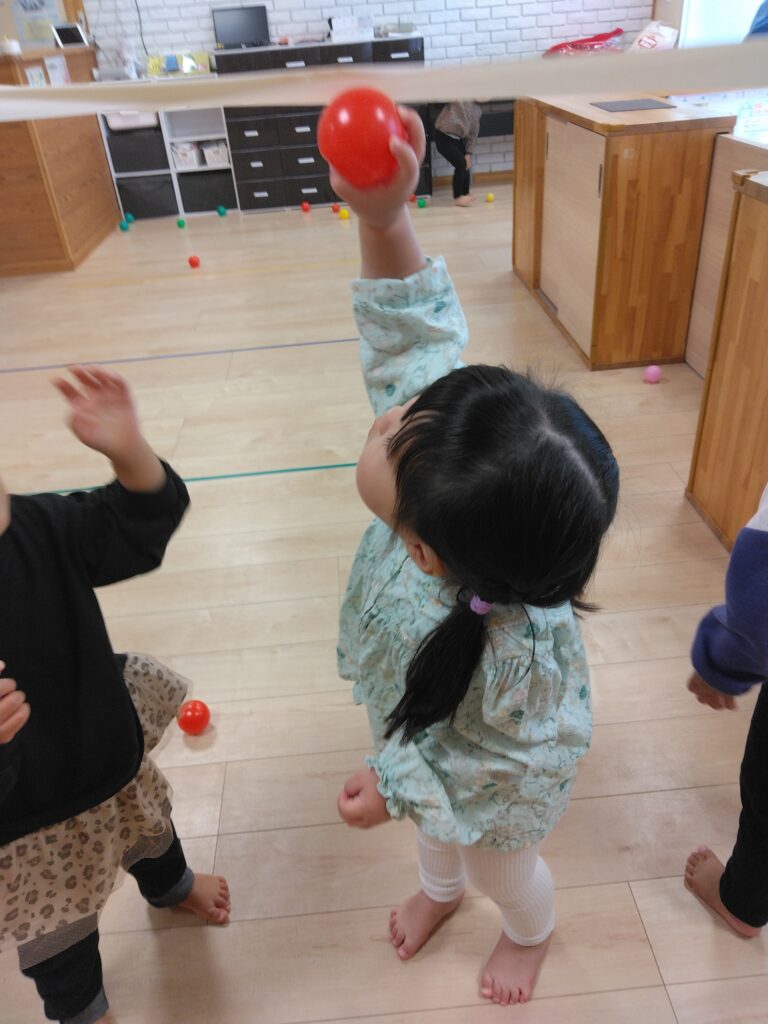 今日はボール遊びをしました。天井からぶら下がる的にボールが付くと、「えー!くっついた!」と大興奮の子どもたち。