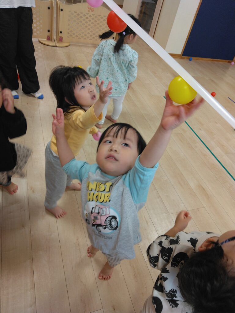 2歳児さんはテープにボールを付けることにも挑戦。段々と高くなっていくテープに、ボールを付けるためにはどうすればいいかを自分で考えて、背伸びをしたり、ジャンプをしたり、真上に投げたりしていました☺️
