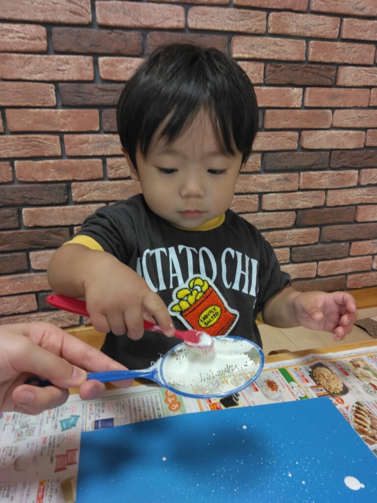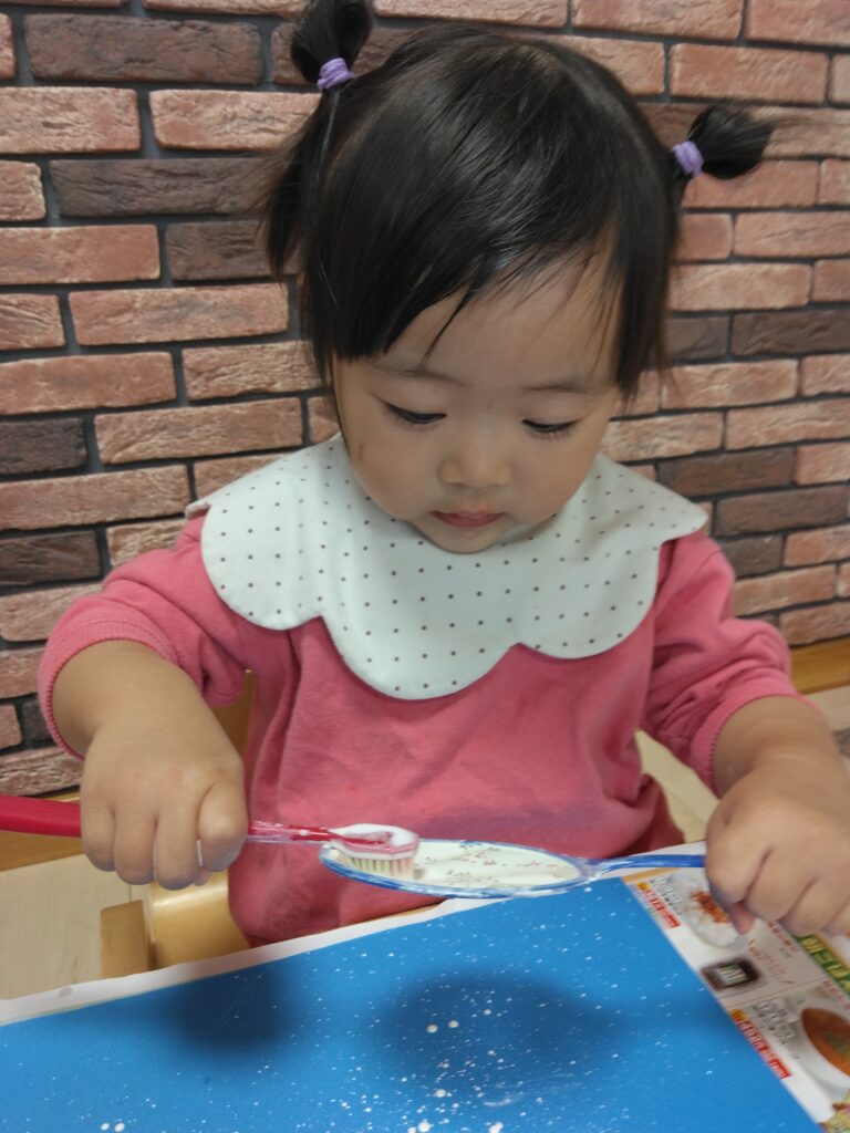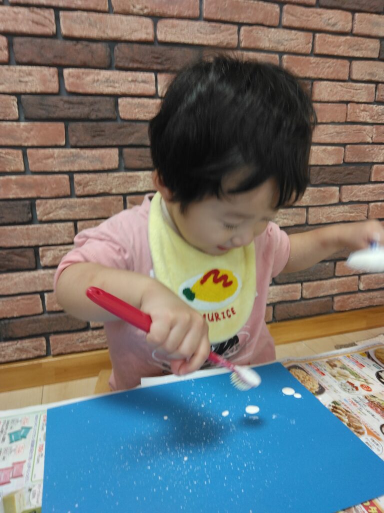 1歳児さんは制作もしています。スパッタリングという表現技法に挑戦。