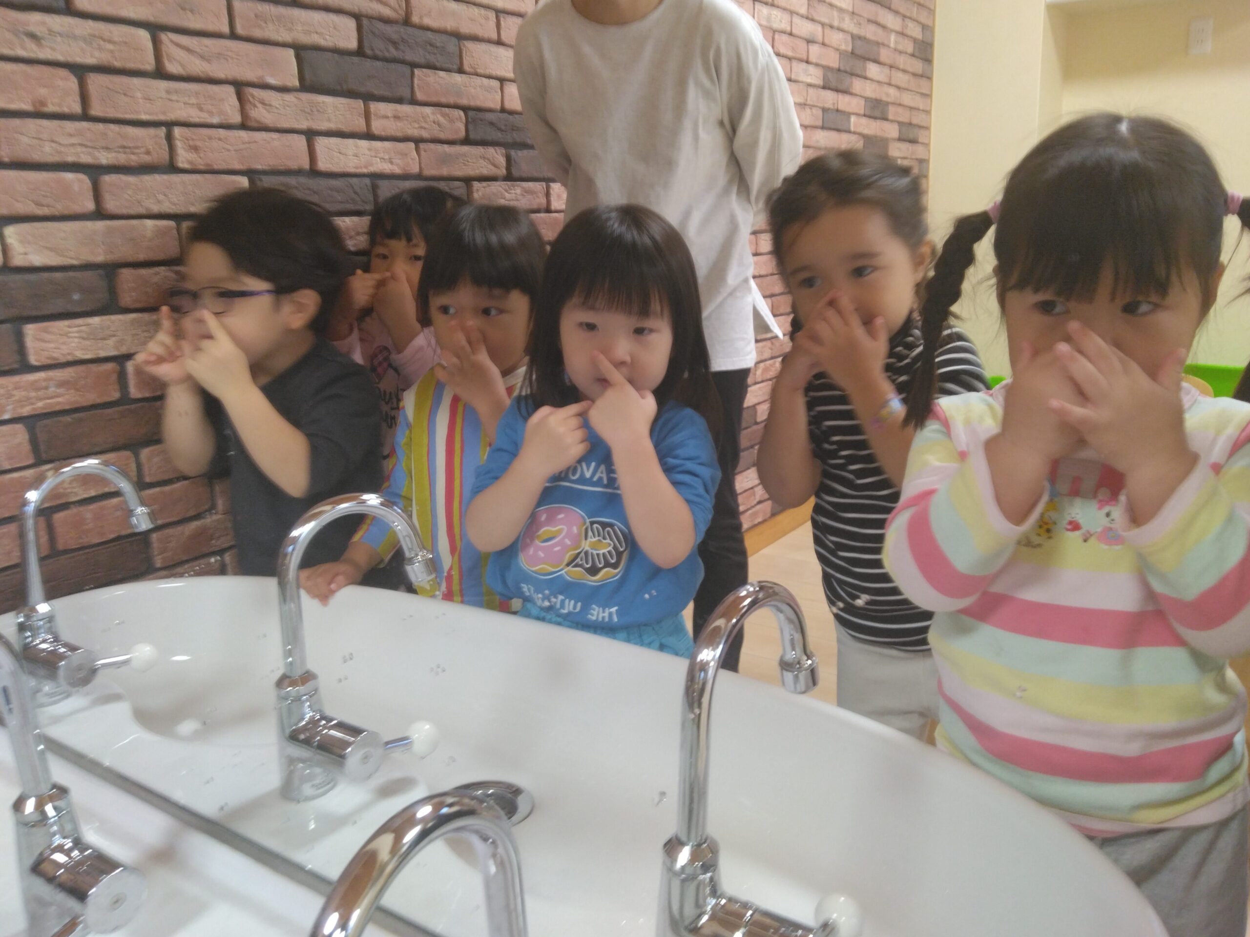 目は2つある、鼻と口は一つだね!とお話しながら顔のパーツがどこに何個あるかを見る子どもたち。