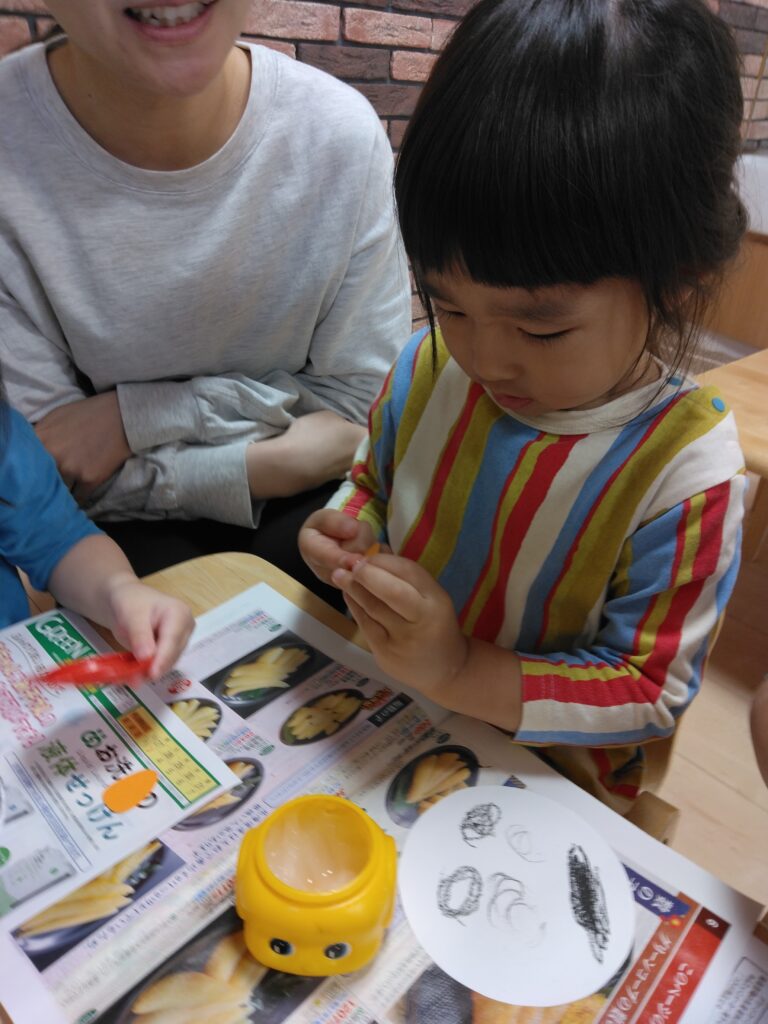 今日、2歳児さんは12月の製作で雪だるまに目と口を描きました。