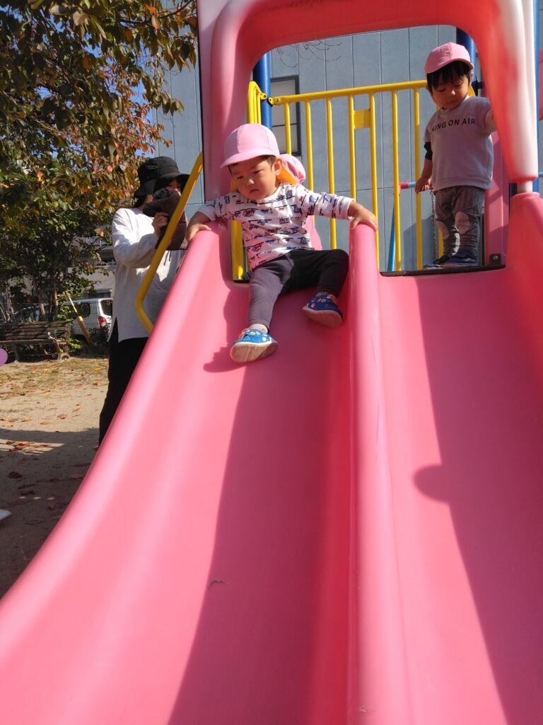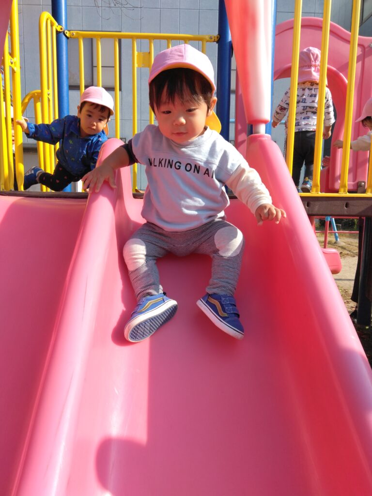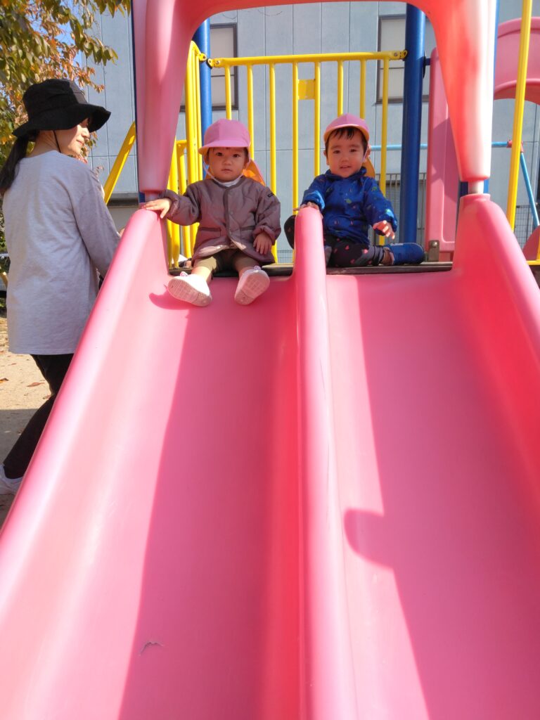 滑り台を上手に滑る子どもたち。座って滑ることが、しっかり身についていますね🌟