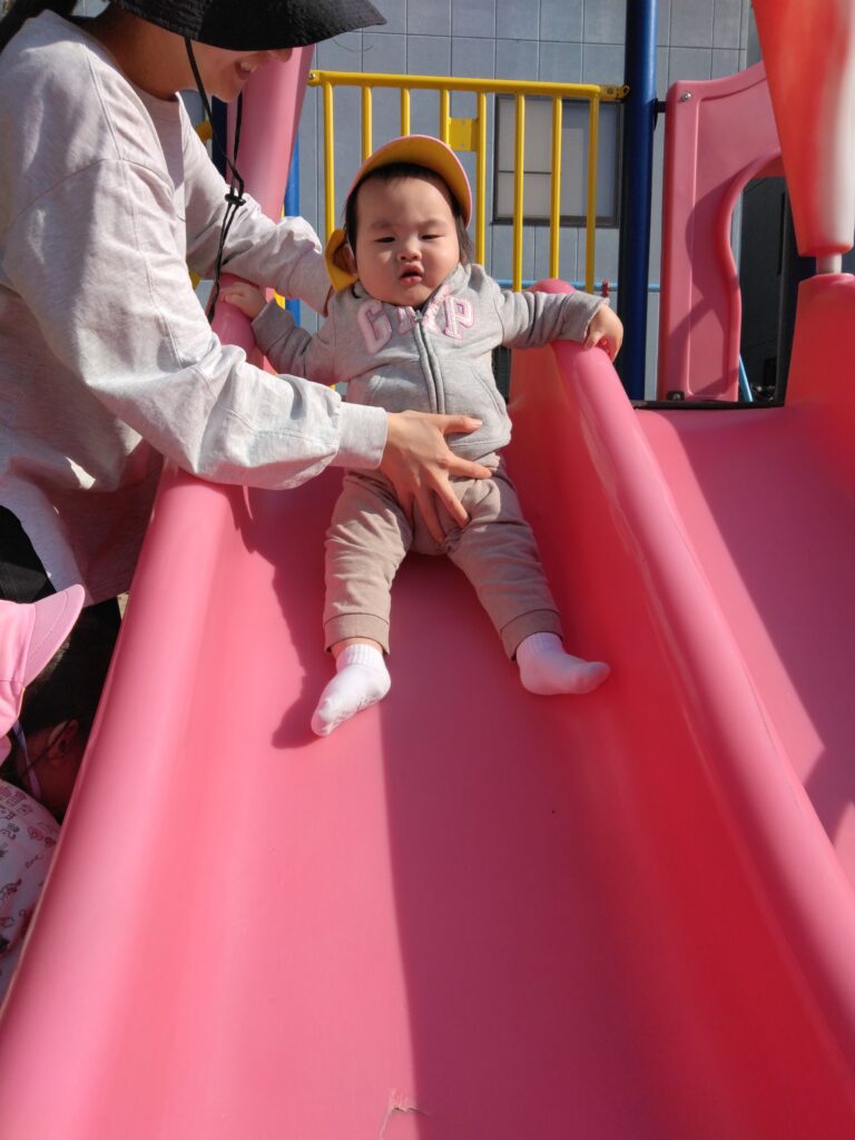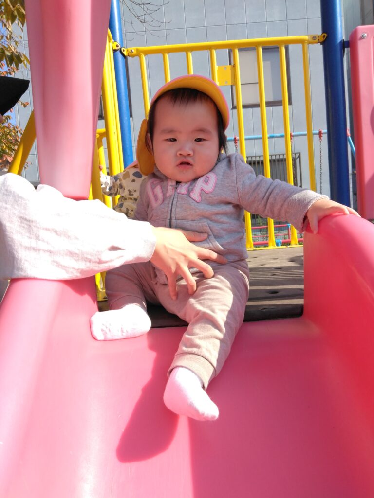 初めはドキドキした表情でしたが、何度も滑ると「楽しい!」に変わっていった0歳児さんです✨