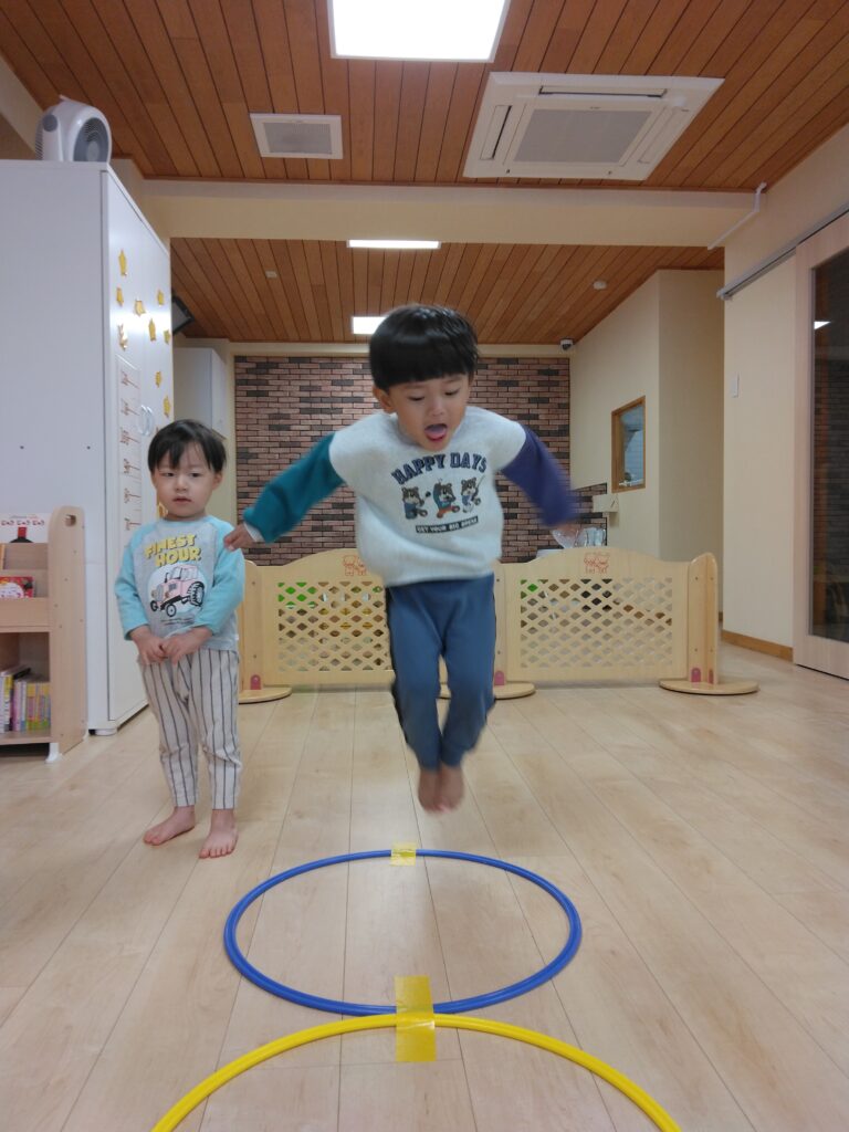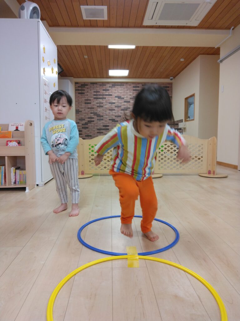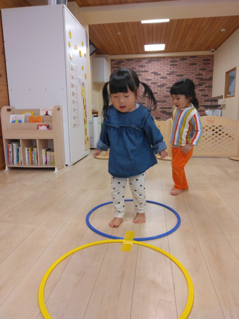 次はフラフープをジャンプジャンプ!両足ジャンプが楽しくてにこにこです😊