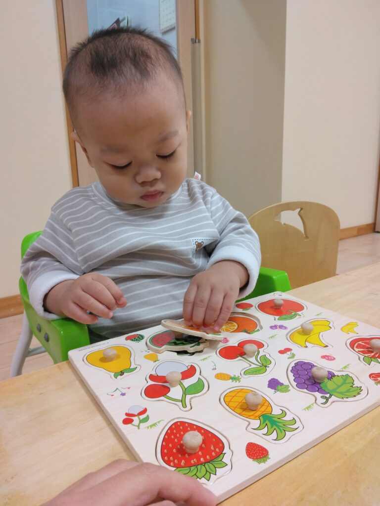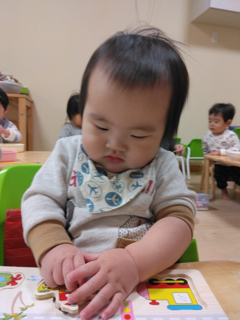 0歳児さんは型はめパズル。様々な色や形、イラストに興味津々でした⭐️