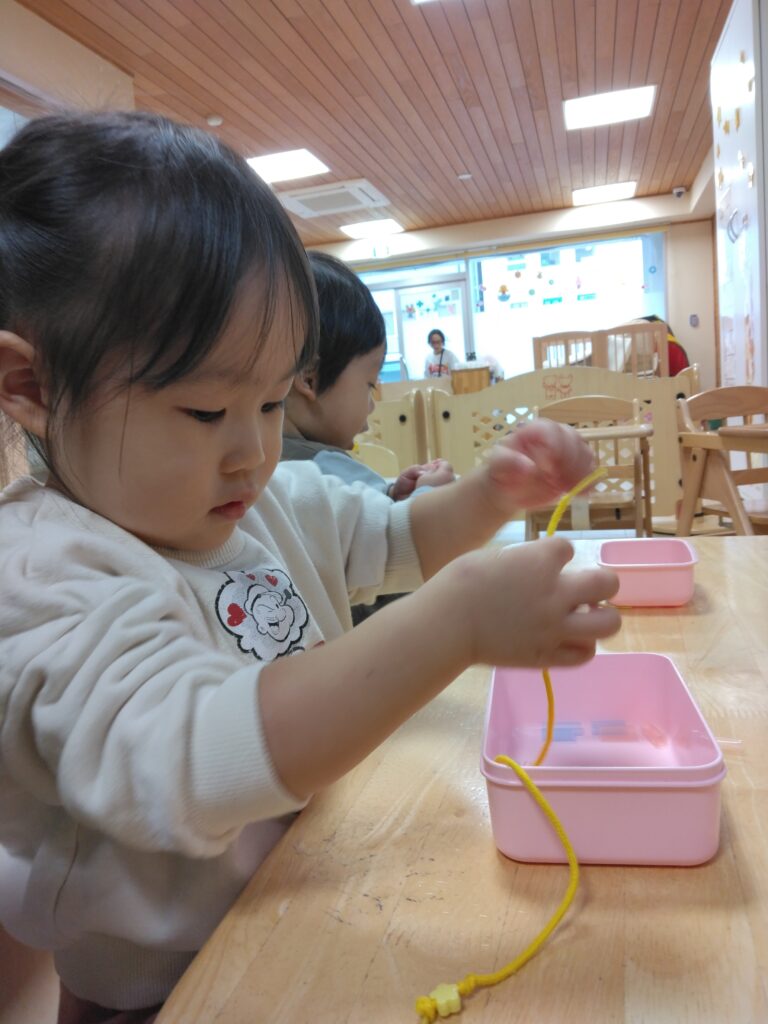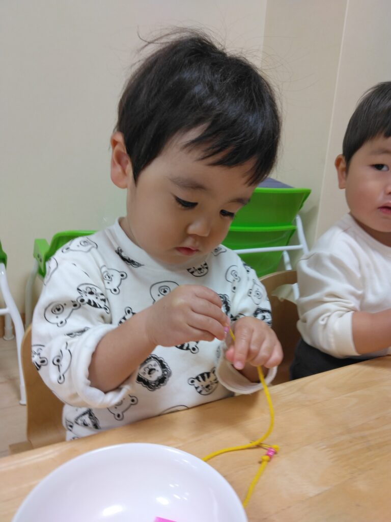 保育室では机上遊び。初めての紐通しに挑戦です。