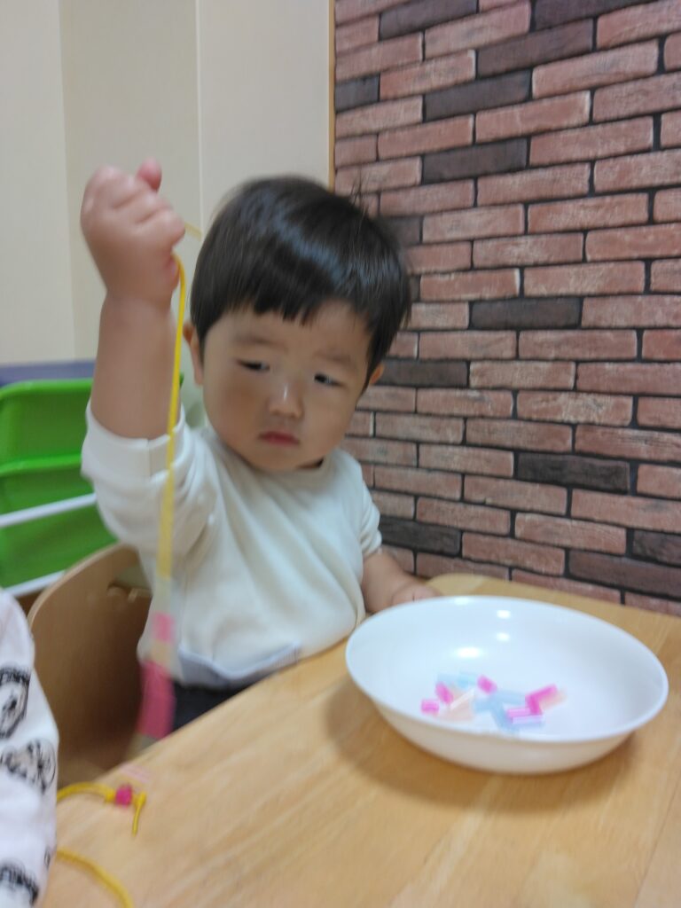 コツを掴むまでがなかなか難しい様子。それでもチャレンジし、保育者に手伝いでストローに通すことができると大喜びでした😊