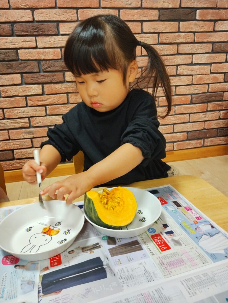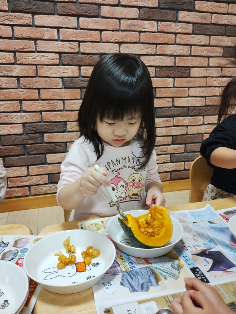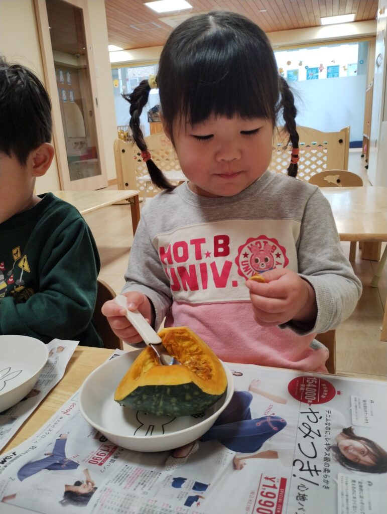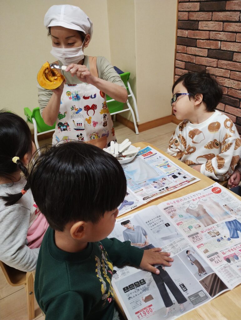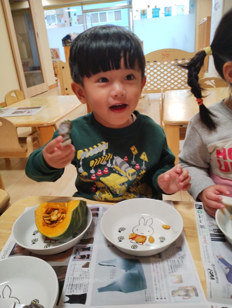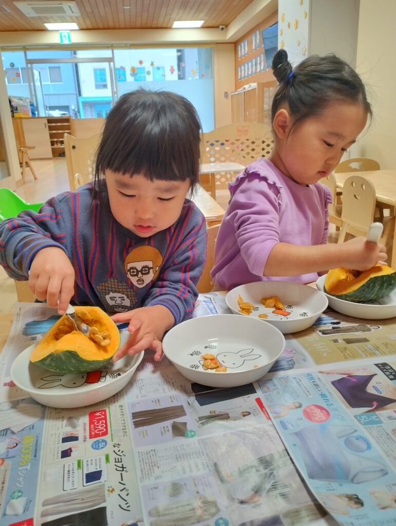 食育がありました。カボチャの種取りをしましたよ🎃種の取り方を教えてもらい、いざ挑戦!