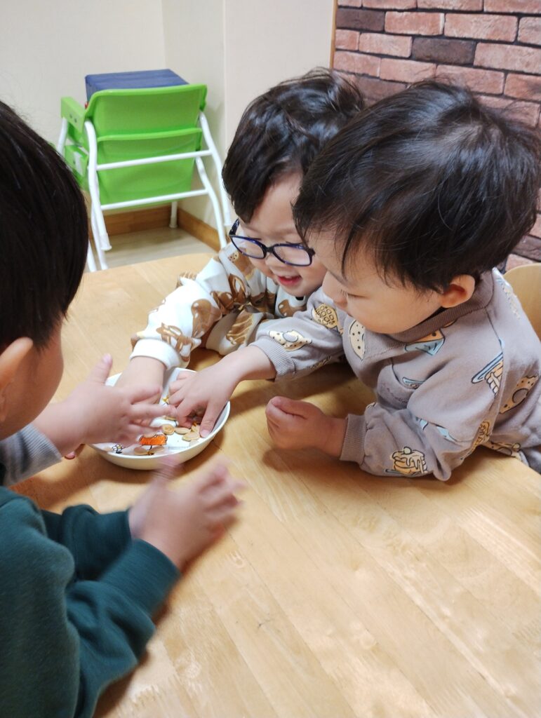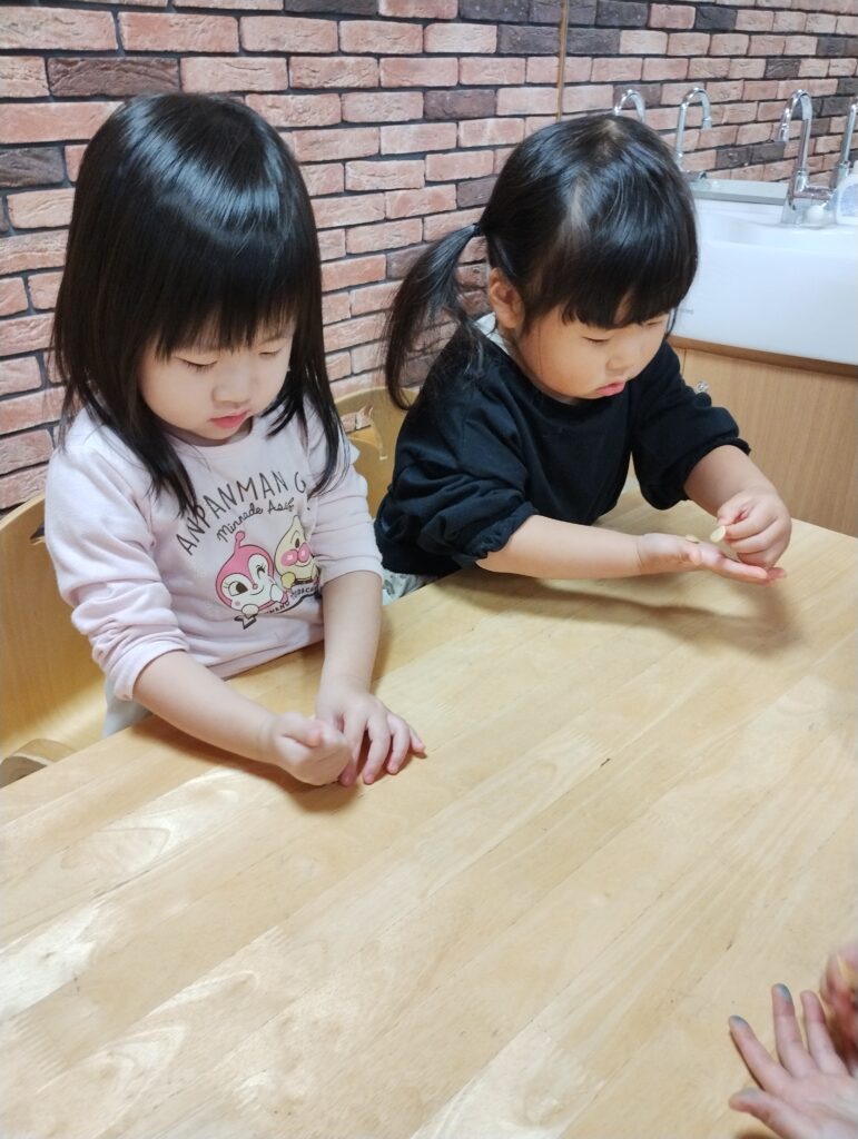 丁寧に洗ってワタを取り除いたカボチャの種。ツルツル?硬い?感触を確かめるように触っていた子どもたちです。