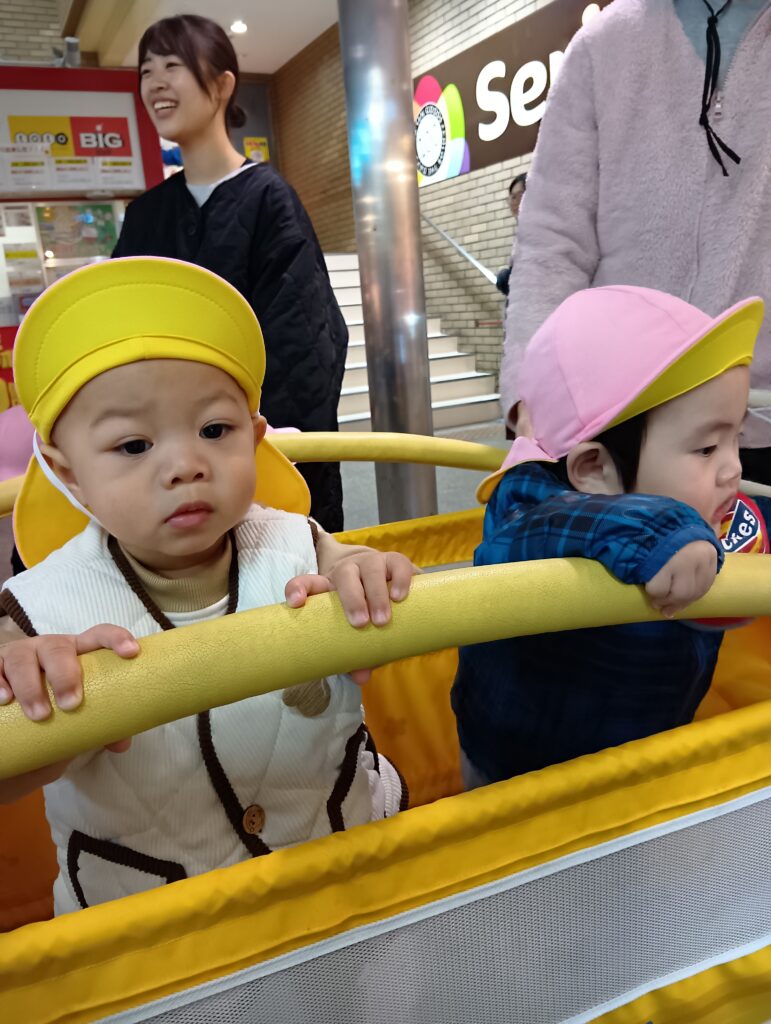 0歳児さんは散歩車の中から散歩を楽しんでいます☀
