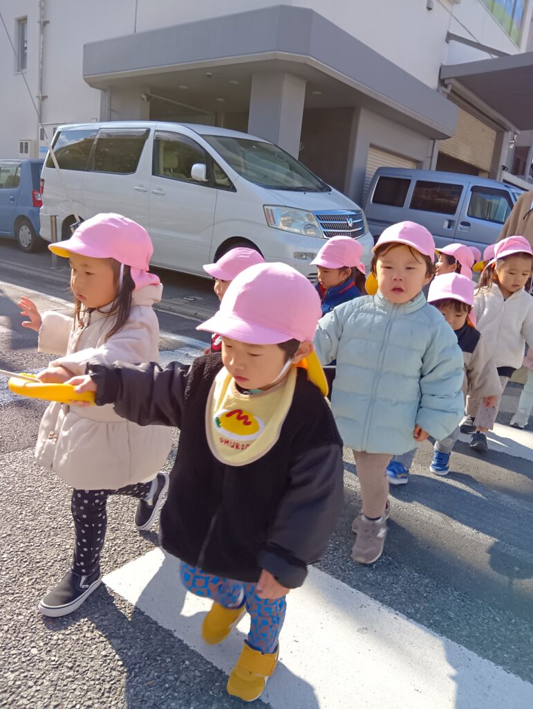 横断歩道を渡る1,2歳児さんが手を挙げているのを見て、上手に真似ていましたよ⭐️