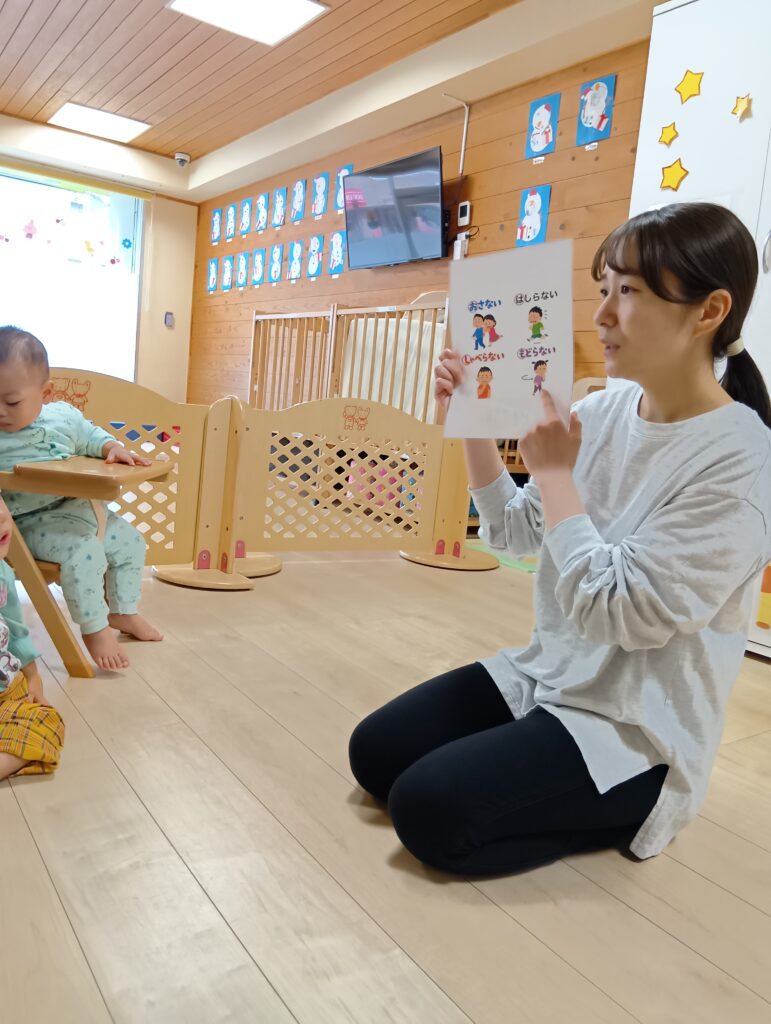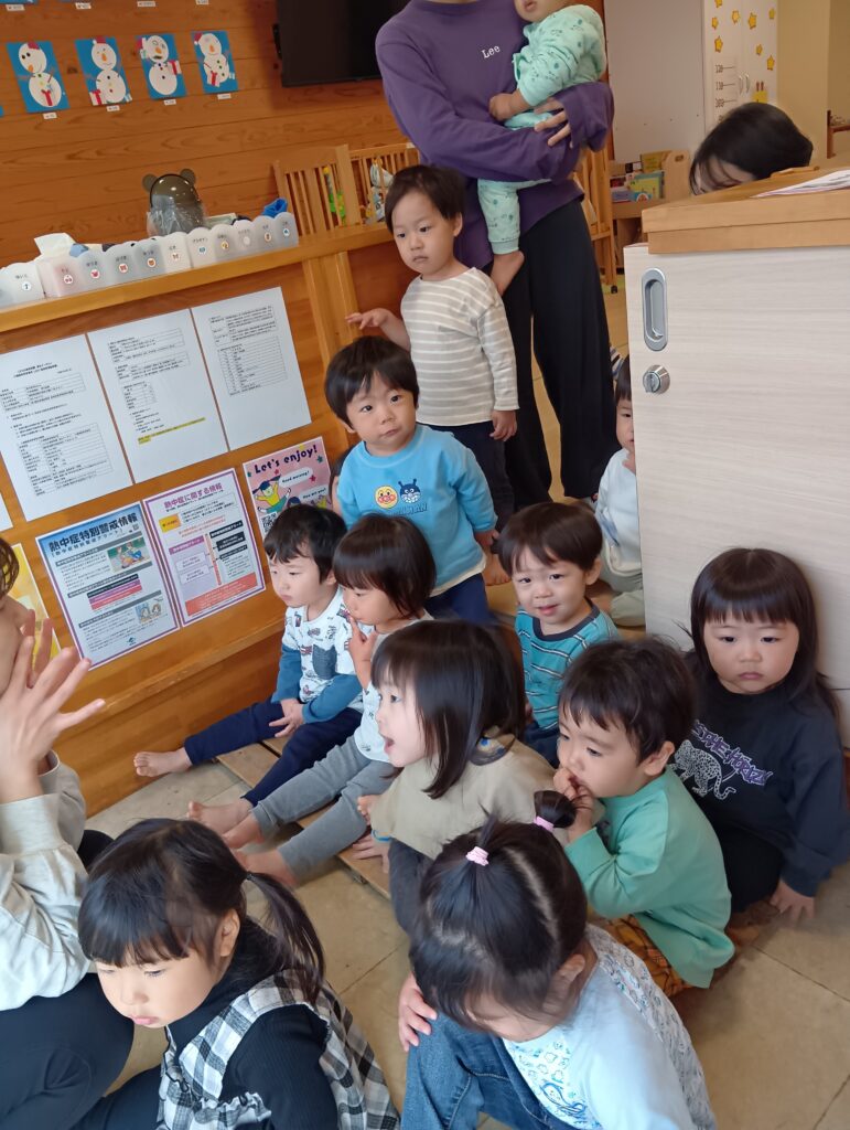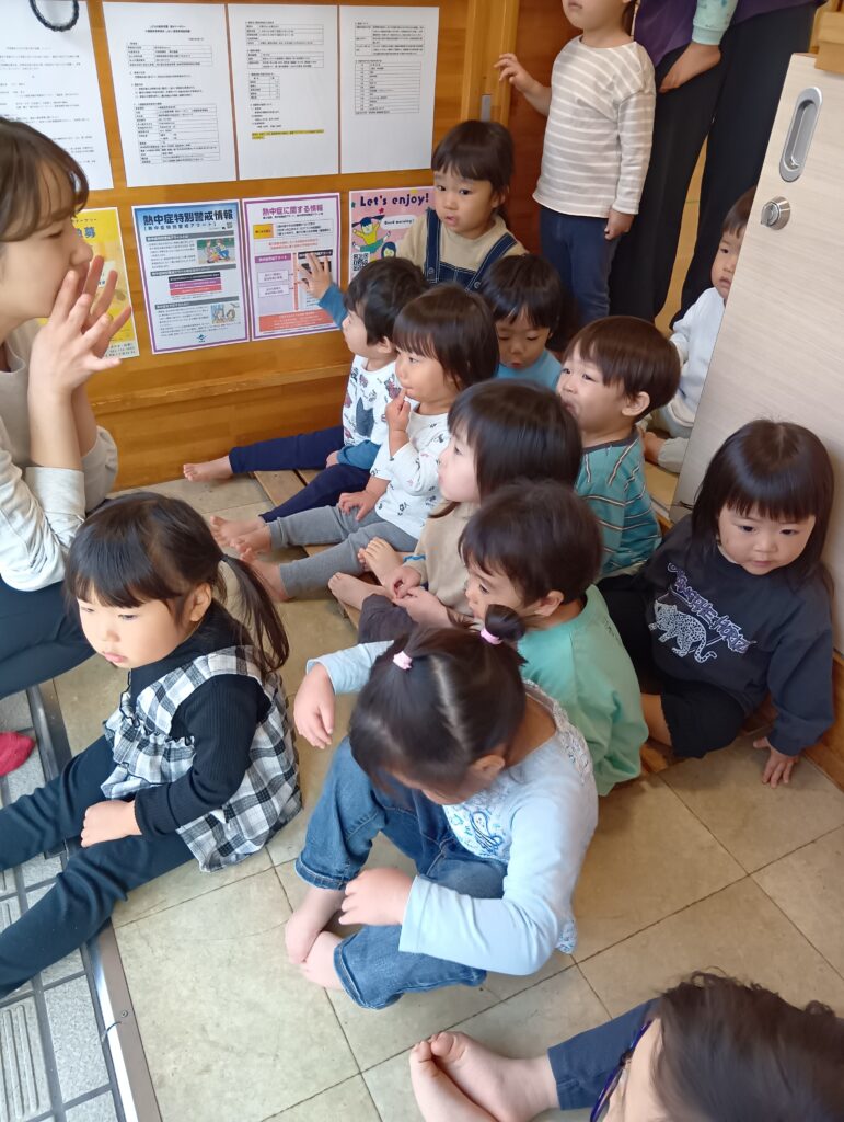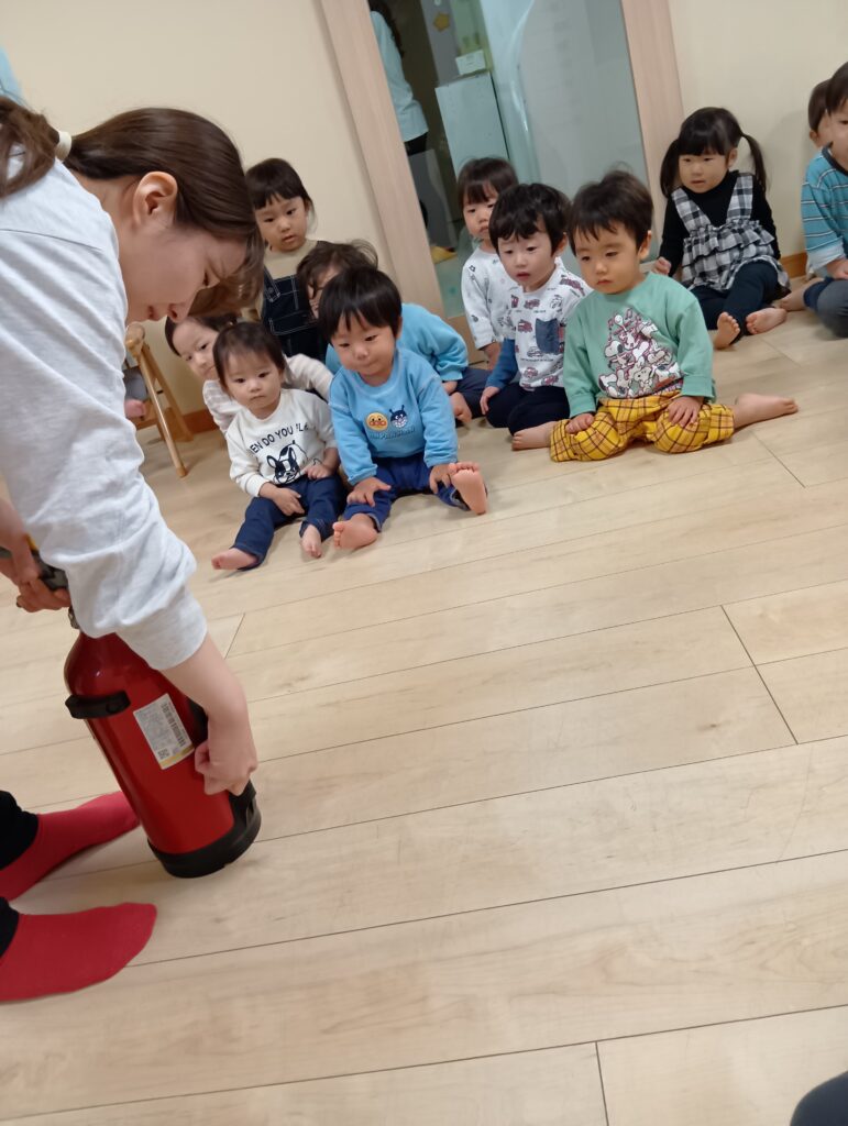 玄関までの避難をした後は、保育室に戻ってどこからの漏電だったかや、消火器の使い方などの話をかっこよく聞く子どもたち。🧯🔥