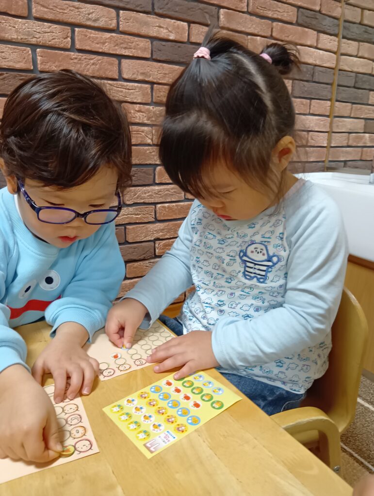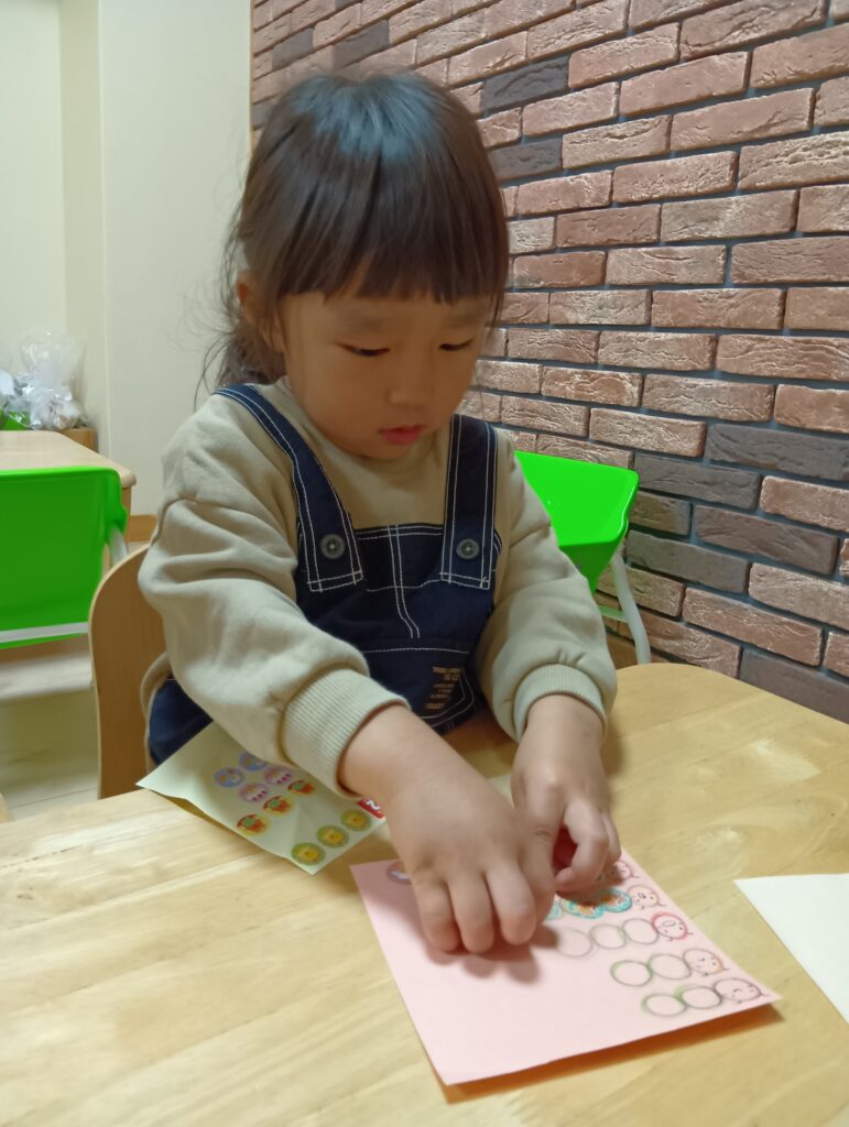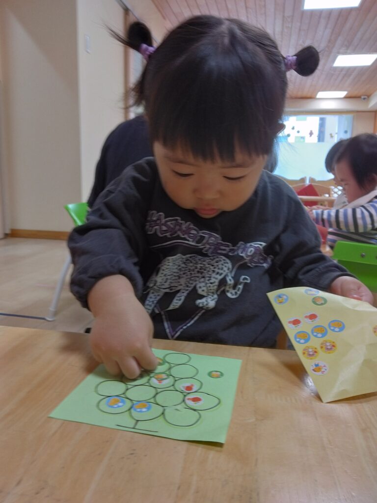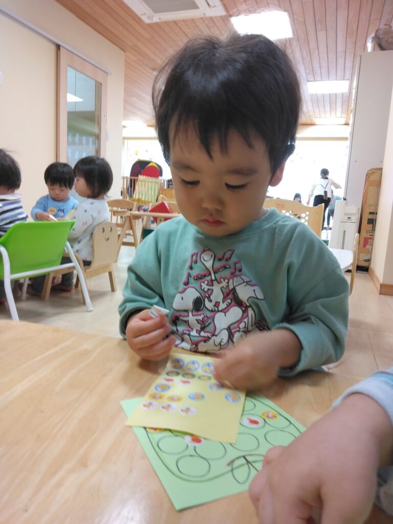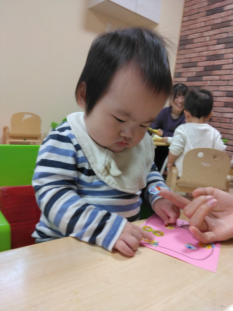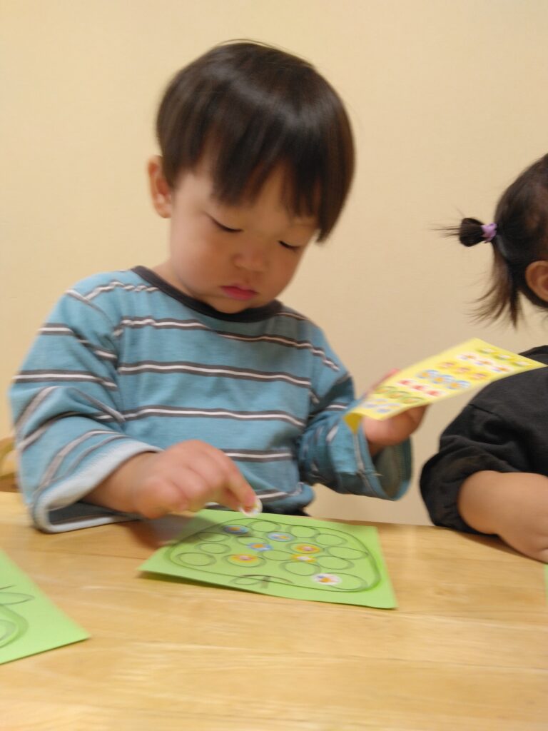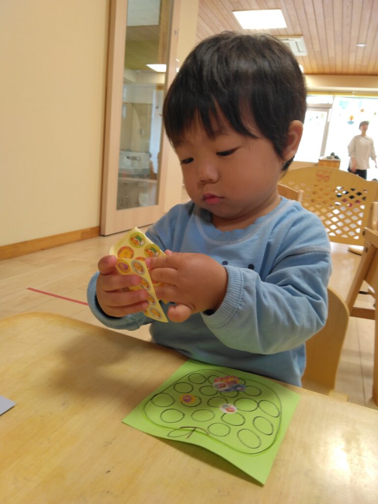 丸の中に上手にシールを貼って遊びましたよ。😆⭐丸に合わせて上手にシールが貼れています!