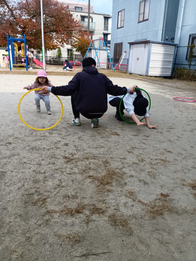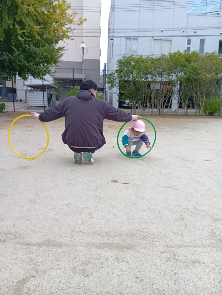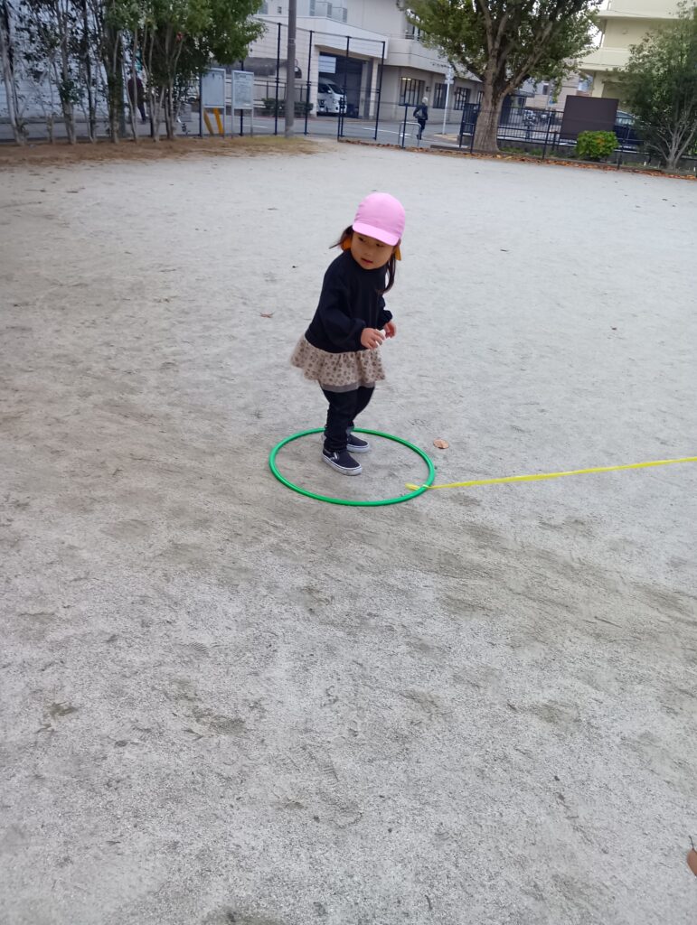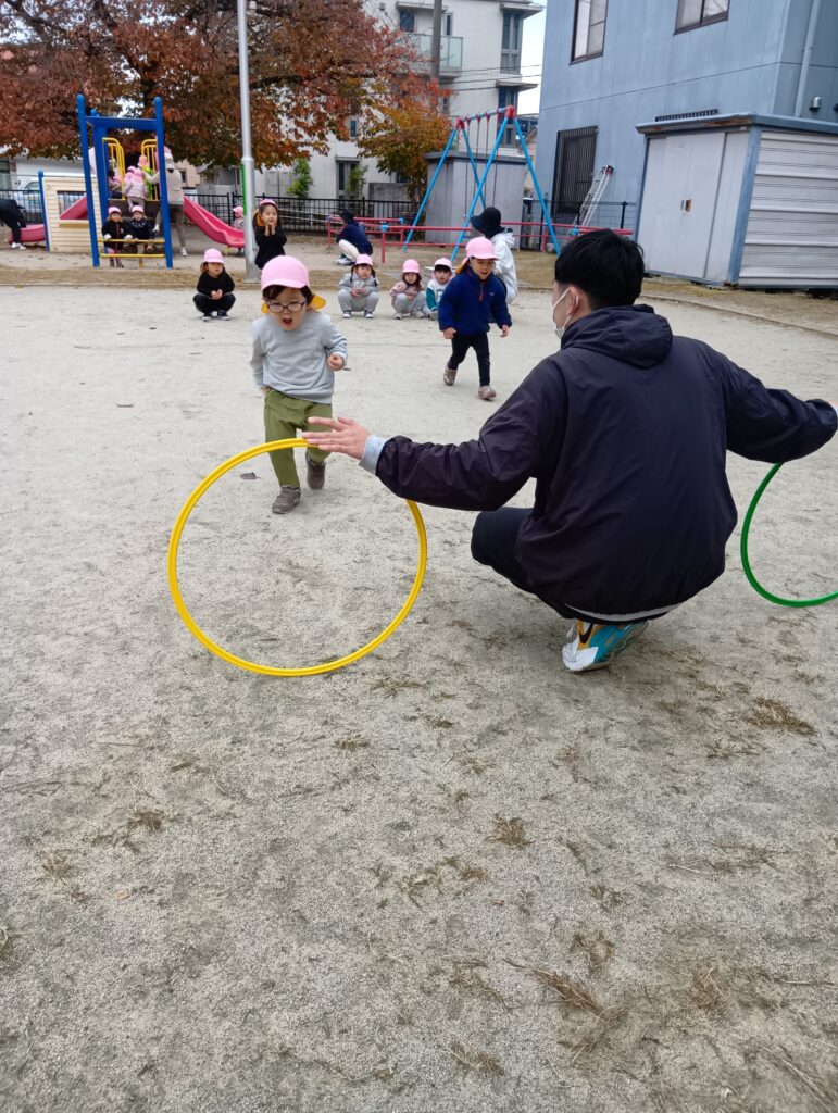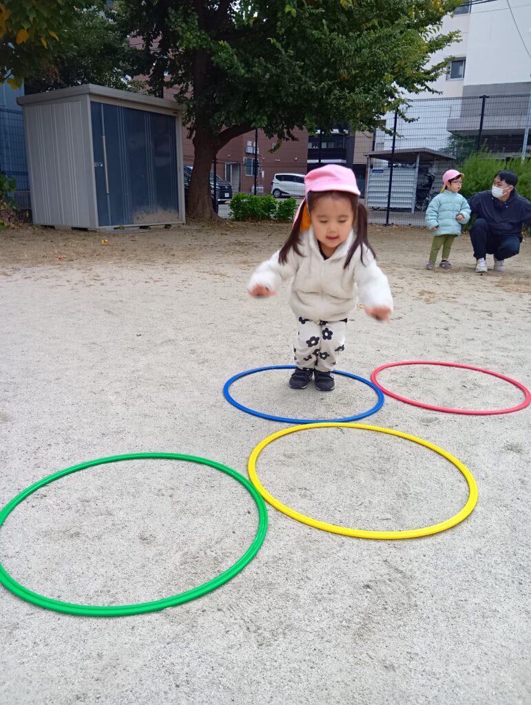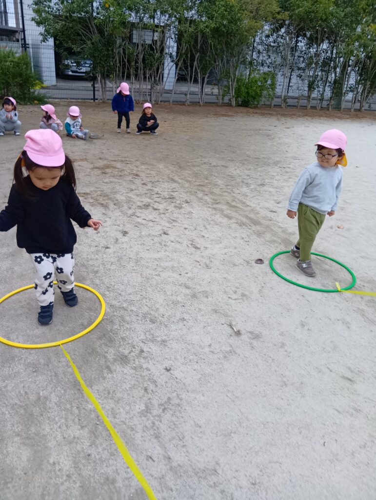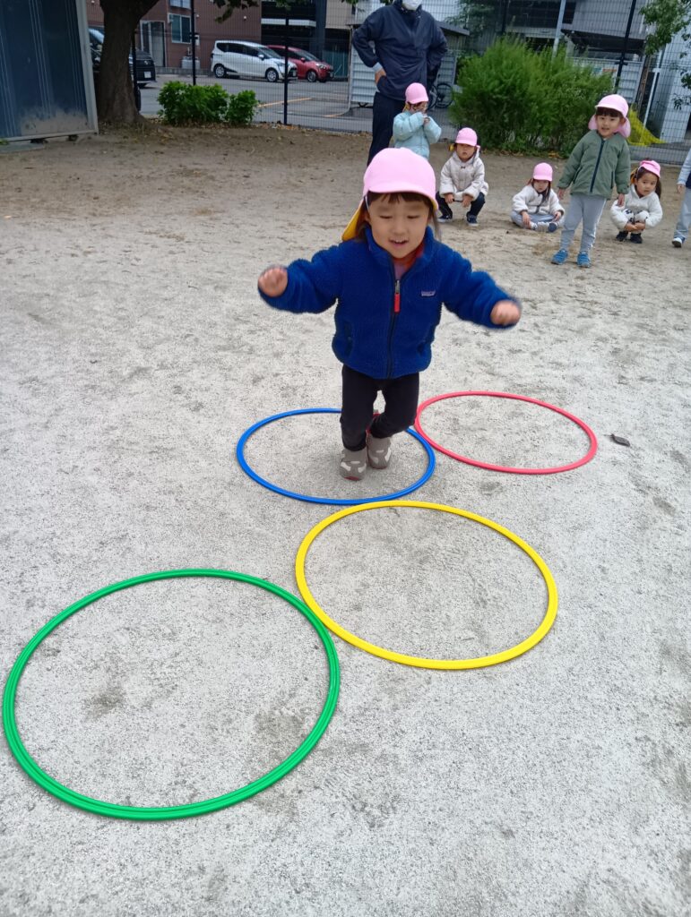 フープジャンプをしたり、フープくぐりをしたりとフープを使った運動遊びに挑戦しました🤩
