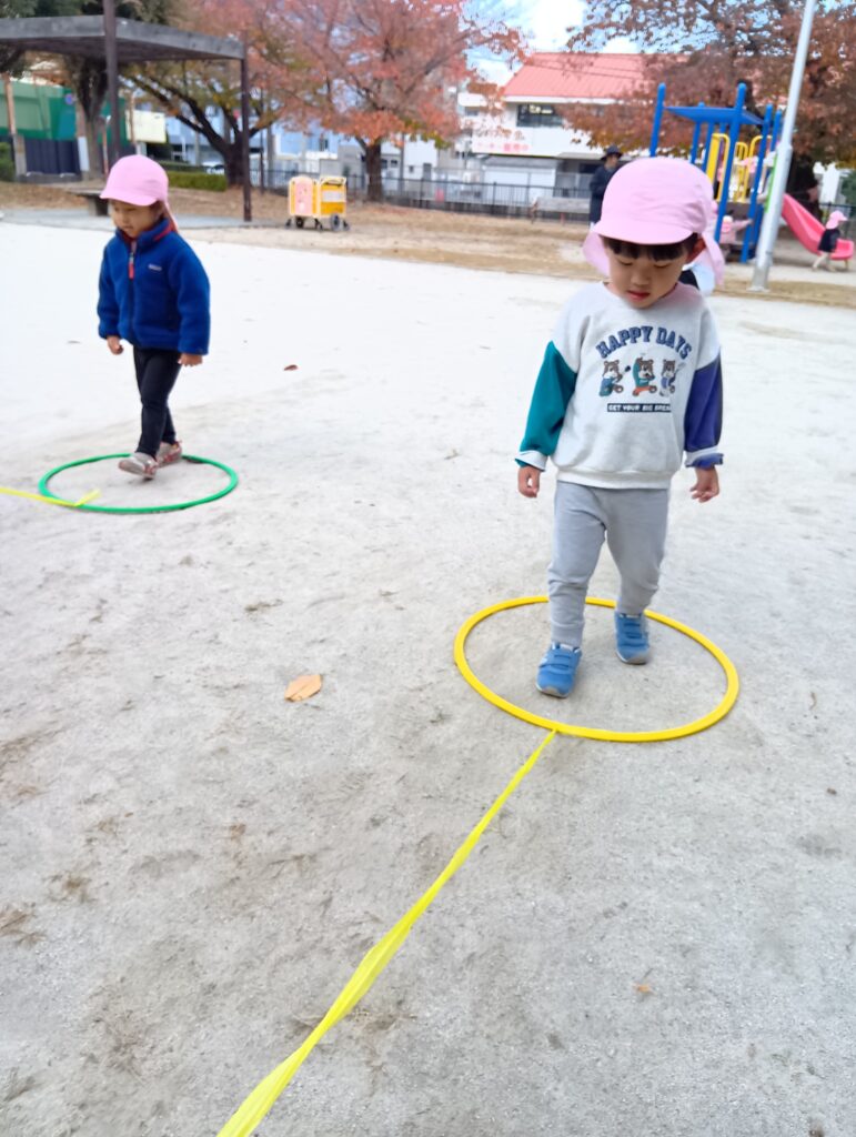スライドするフープの中もはみ出さないように考えながら少しずつ進んでいます。お隣さんに負けないように取り組むお友達もいました💪♪