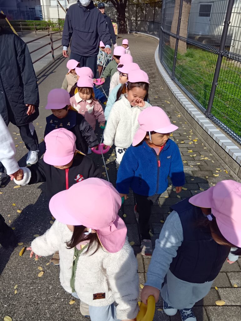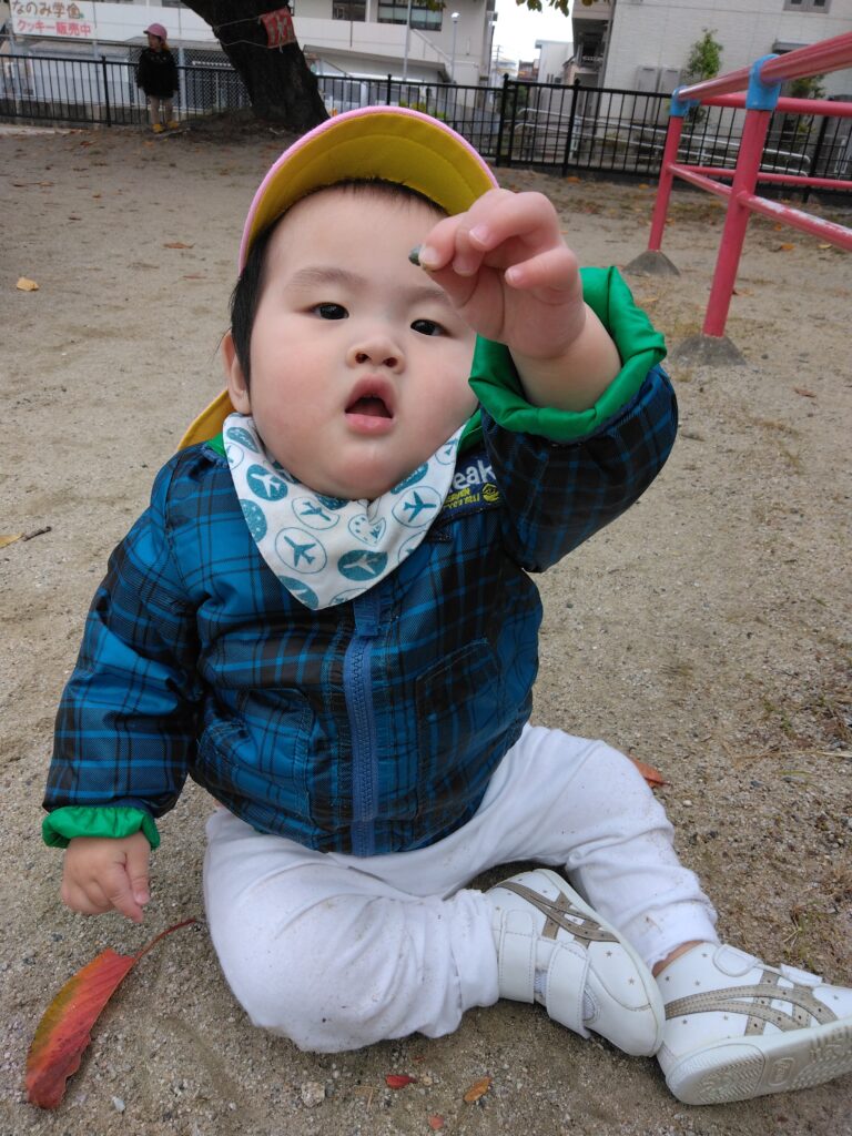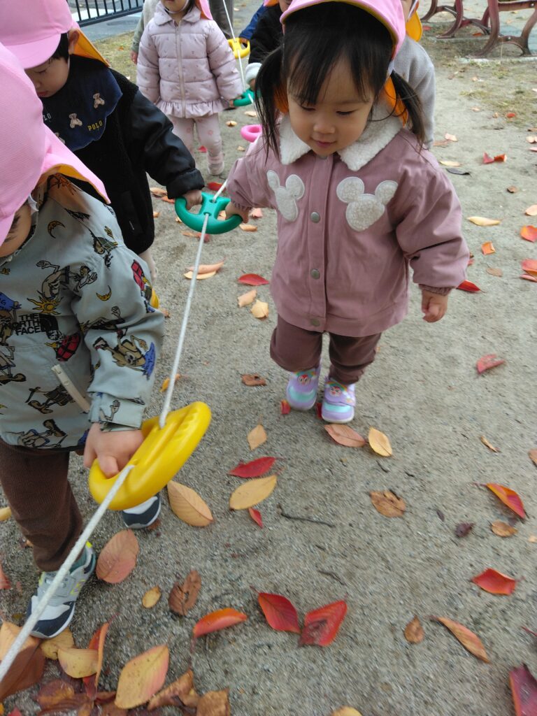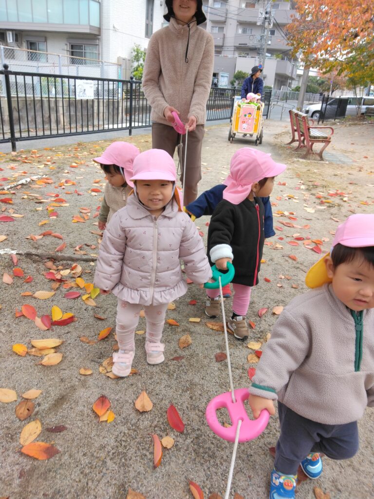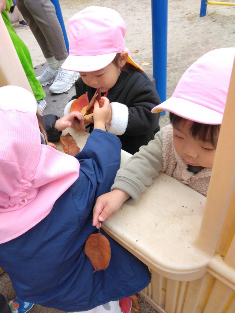 葉っぱがきれいに色付いているのを発見し、散策をしました🎶赤い葉っぱや黄色い葉っぱがたくさんで形にも興味を示す子どもたちでした🍂