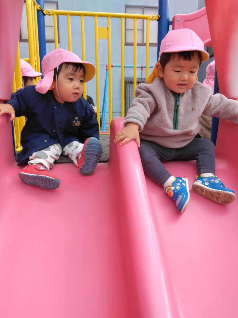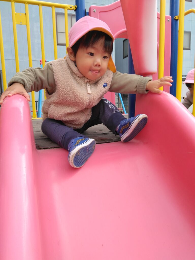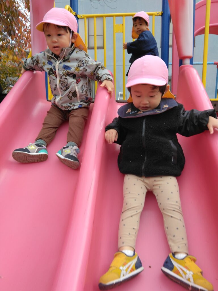 しっかり足をあげて階段を上る子どもたち。大好きな滑り台を何度も楽しんでいます💕