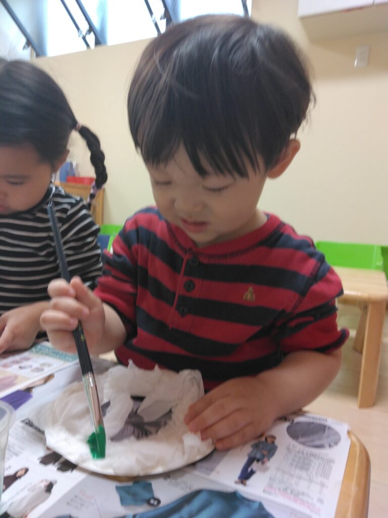 塗る色を変えるときは筆を水で洗う!ということを保育者に教えてもらうと、しっかり覚えて実践する2歳児さん!さすがです✨
