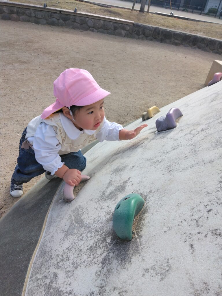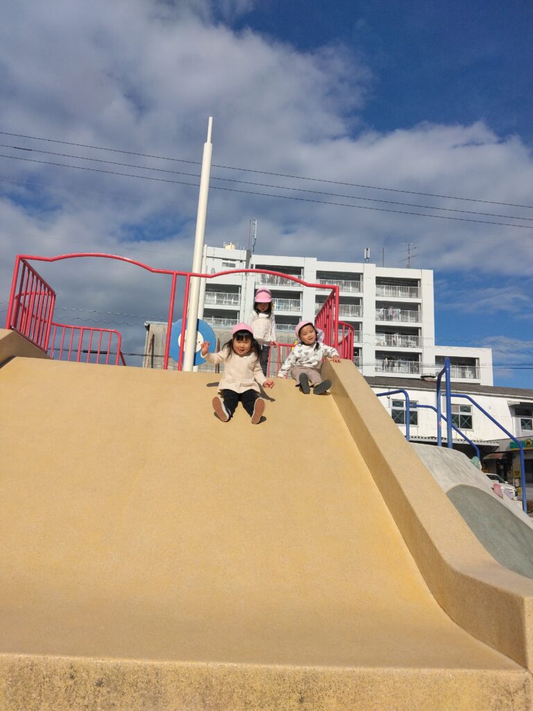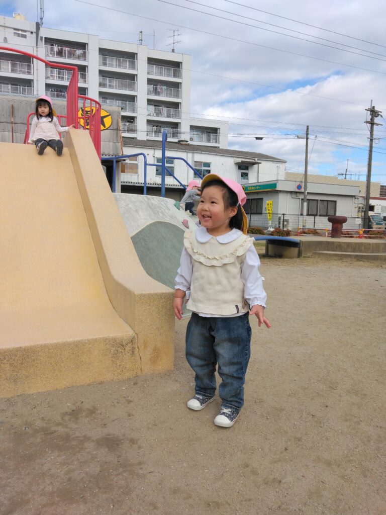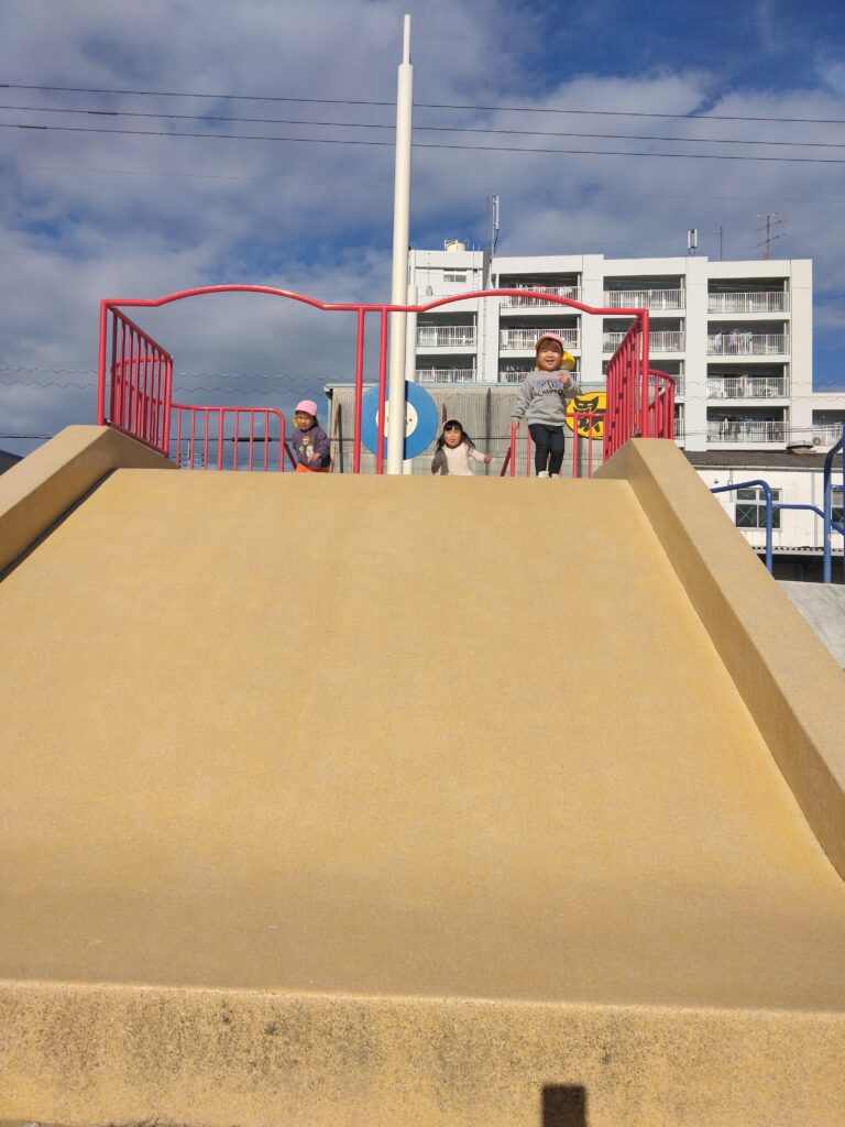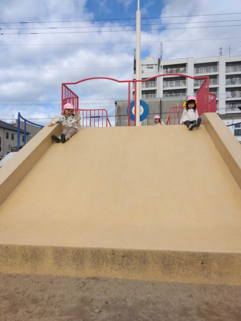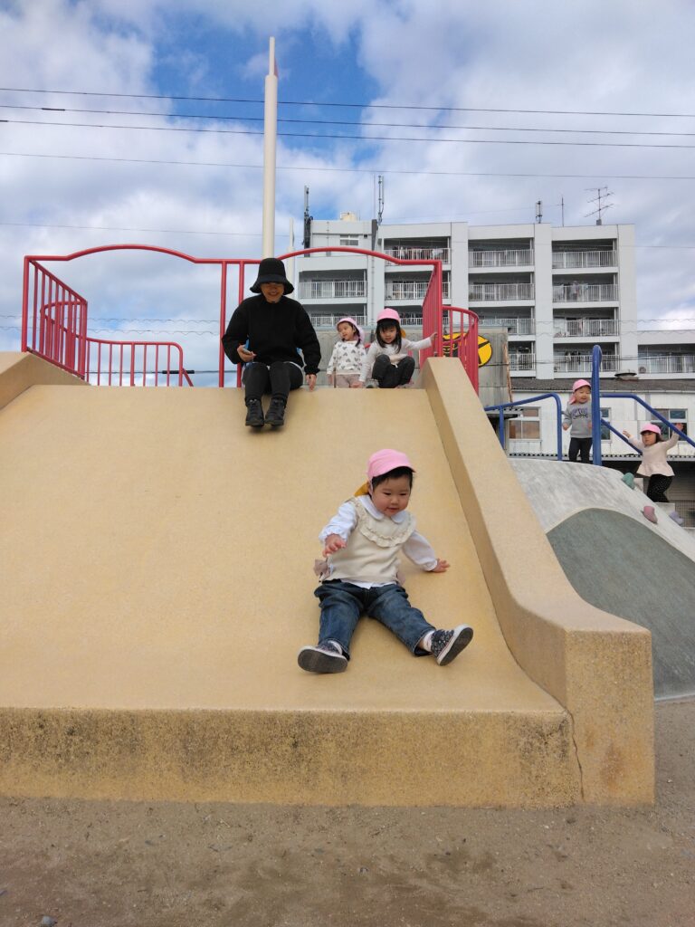 「滑り台しに行くよー!」と保育者が声をかけるとみんな大喜び😆♪