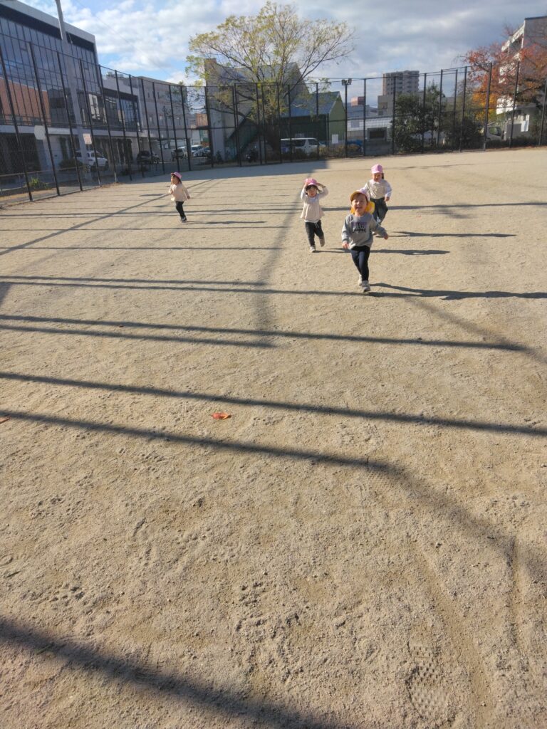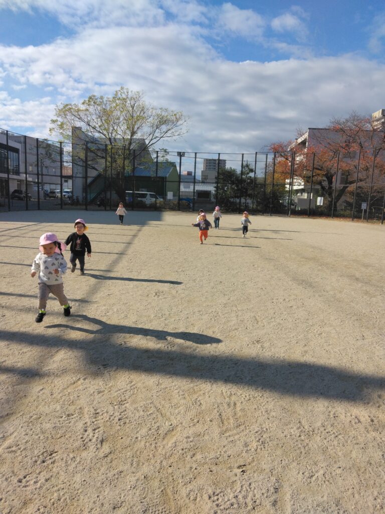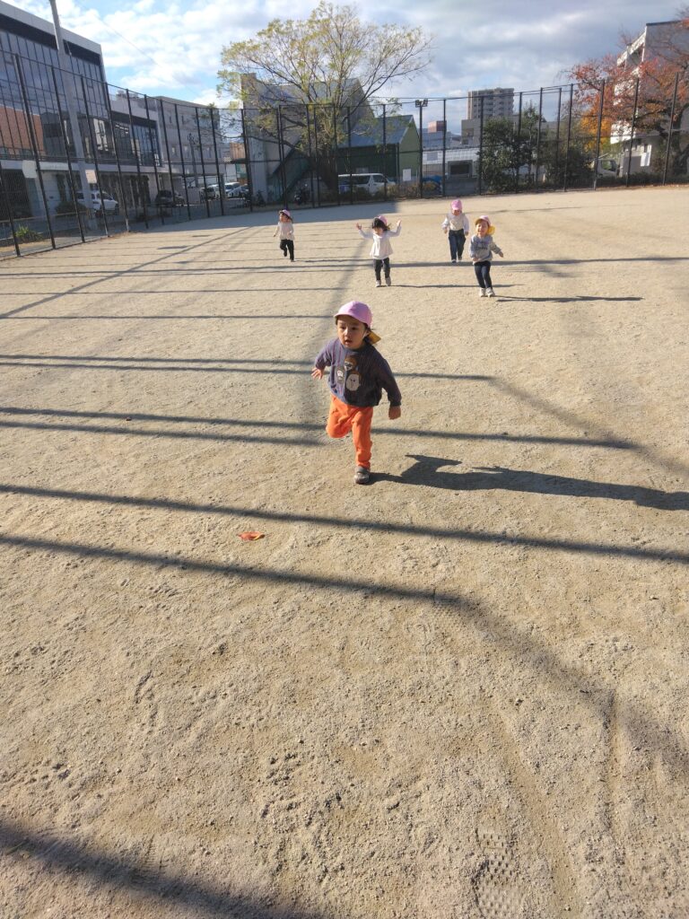 清水中央公園(船公園)で遊びました🌟広場でかけっこです。お日様が照る中、上着を脱いでやる気満々のうさぎ組さん😆いつもより長い距離でしたが、おもいっきり走って気持ちよさそうにゴールしています。