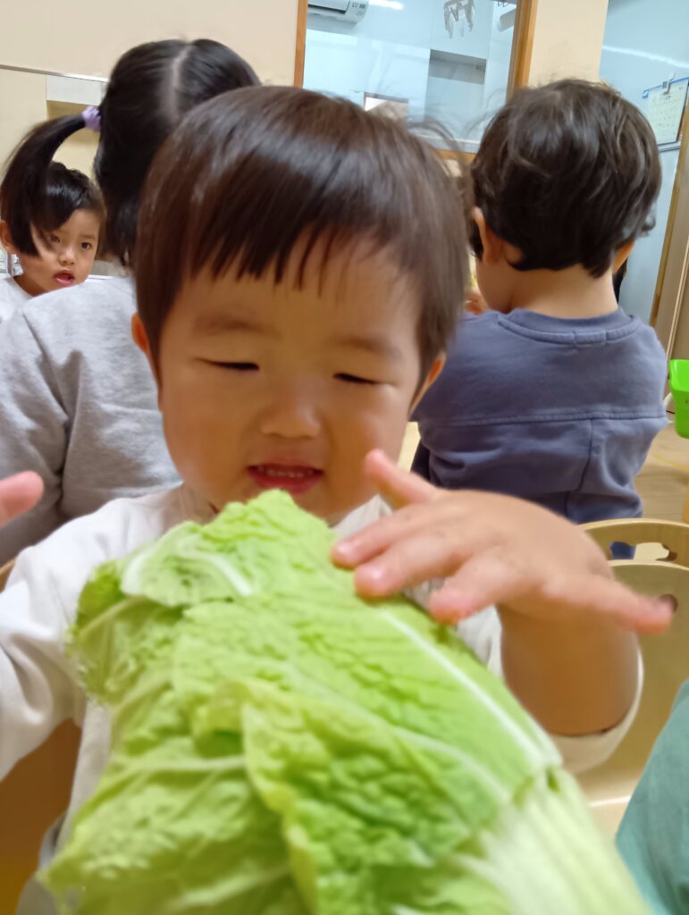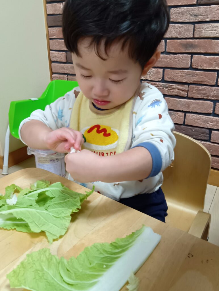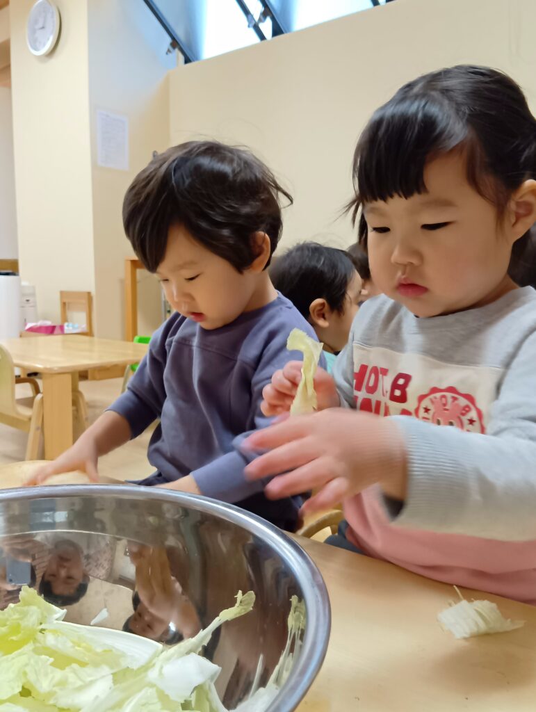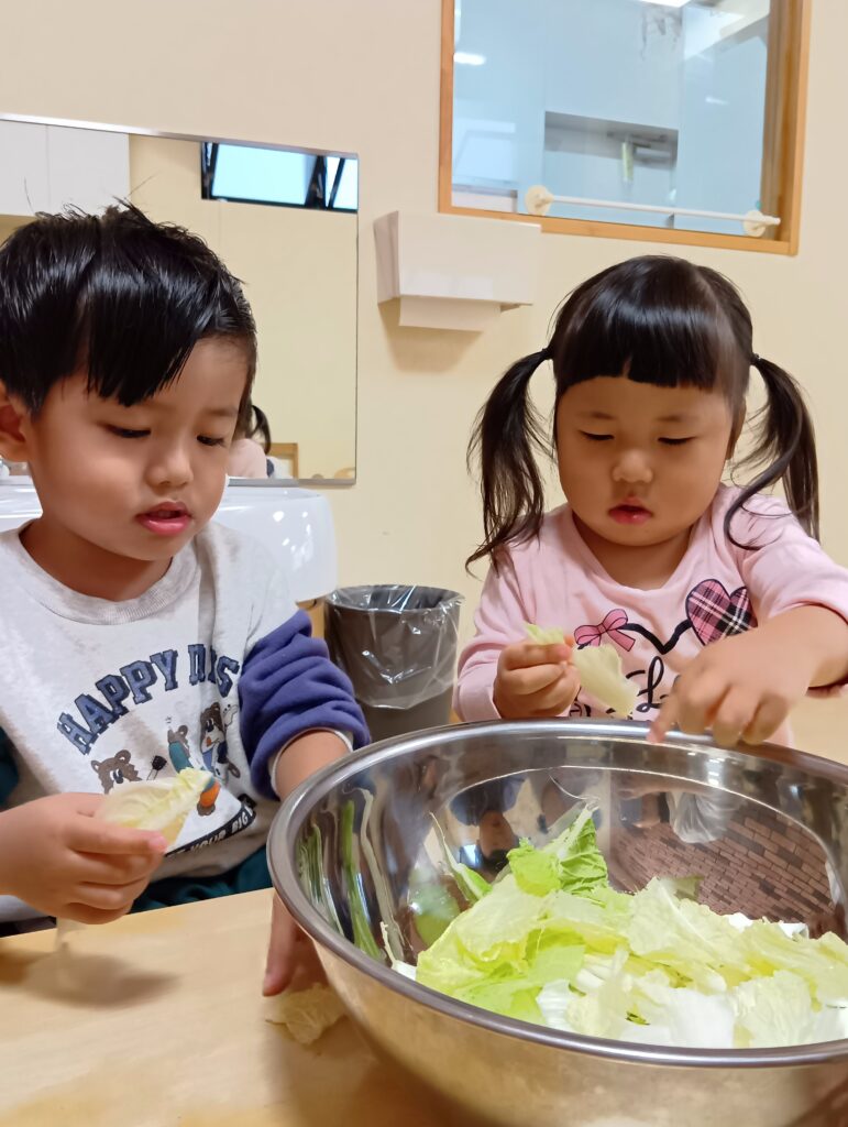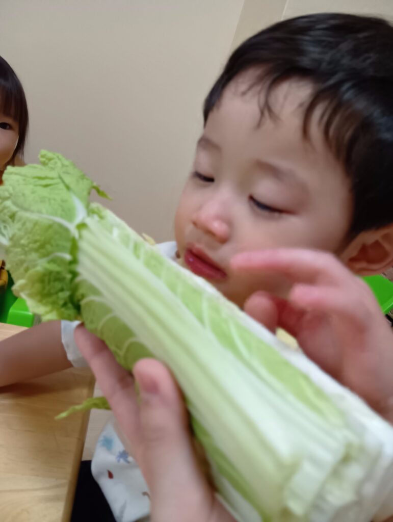 今が旬の白菜を使って、食育をしました。みんなで白菜ちぎりをしましたよ😆白菜ってどんな匂い?どんな手触り?