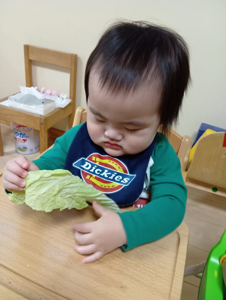 葉の部分は柔らかいので0,1歳児さんでも簡単にちぎることができます。芯は少し硬かったですが、ギュッと力を入れ、ねじるとちぎれました⭐️