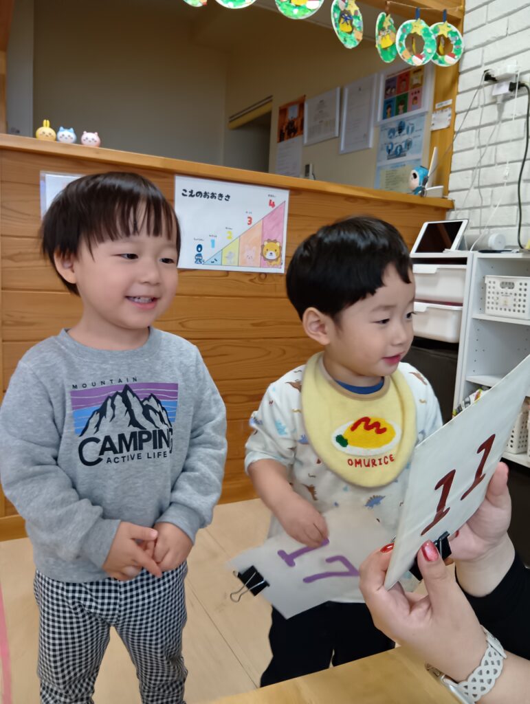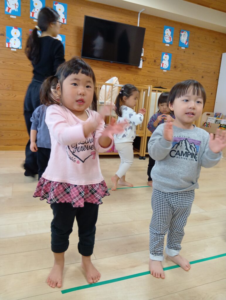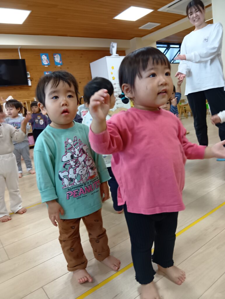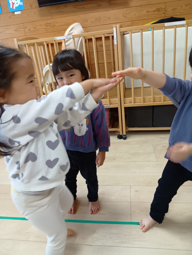 その後は英語教室がありました。「ベイビーシャーク🦈🎵」「ダディーシャーク🦈🎵」指や手、腕をしっかり動かしてサメの大きさを表現しています。