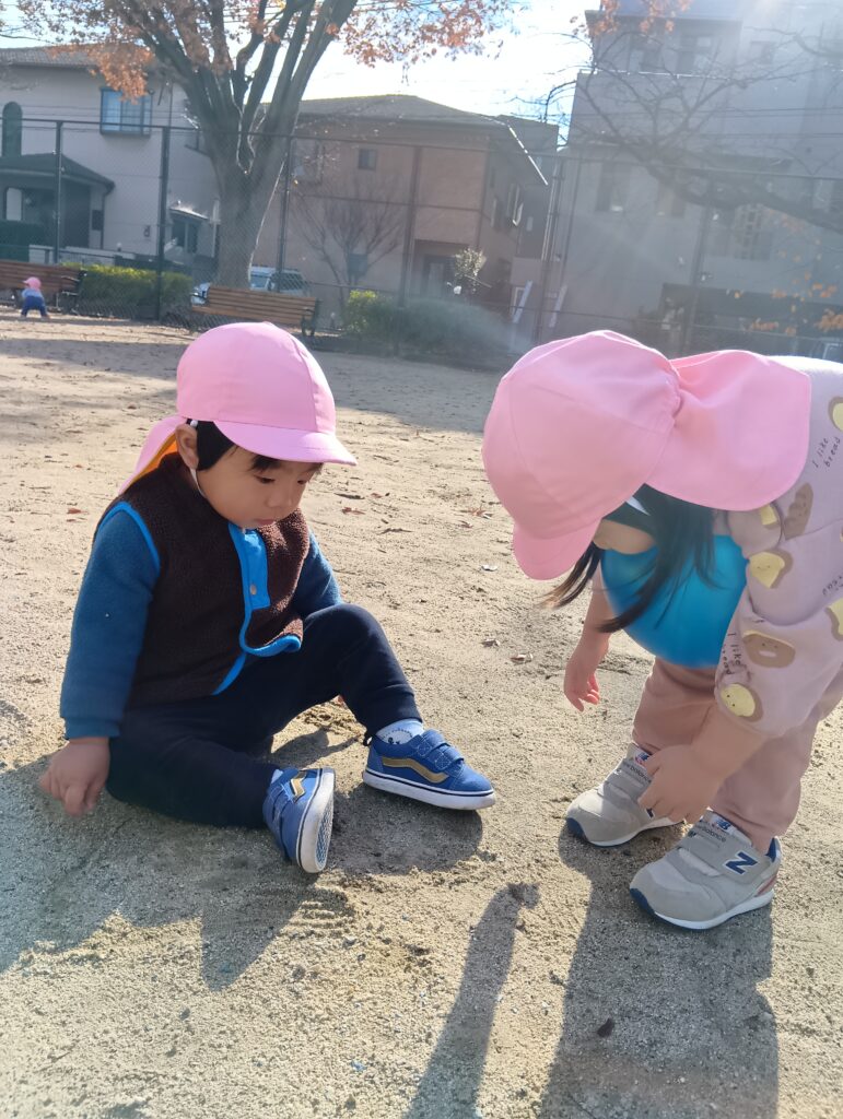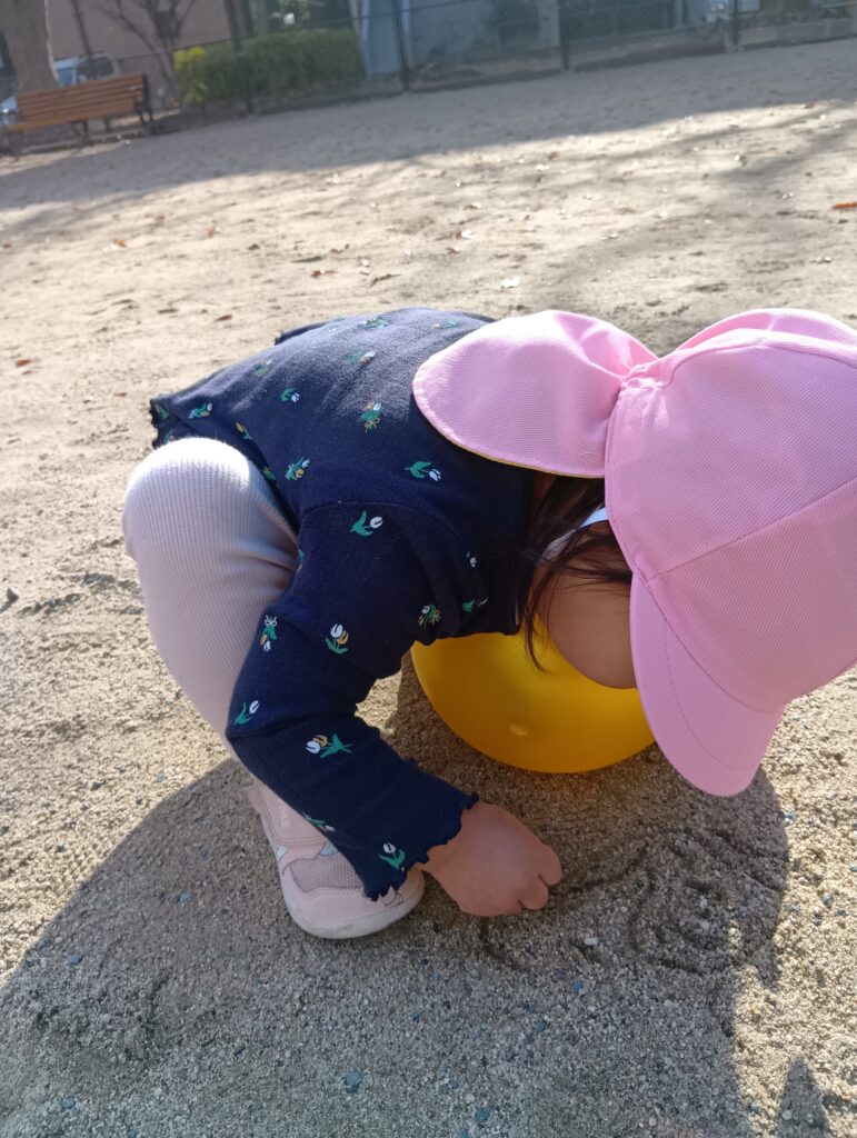 遊びがどんどんダイナミックになり、砂の感触を確かめながら遊んでいます。
