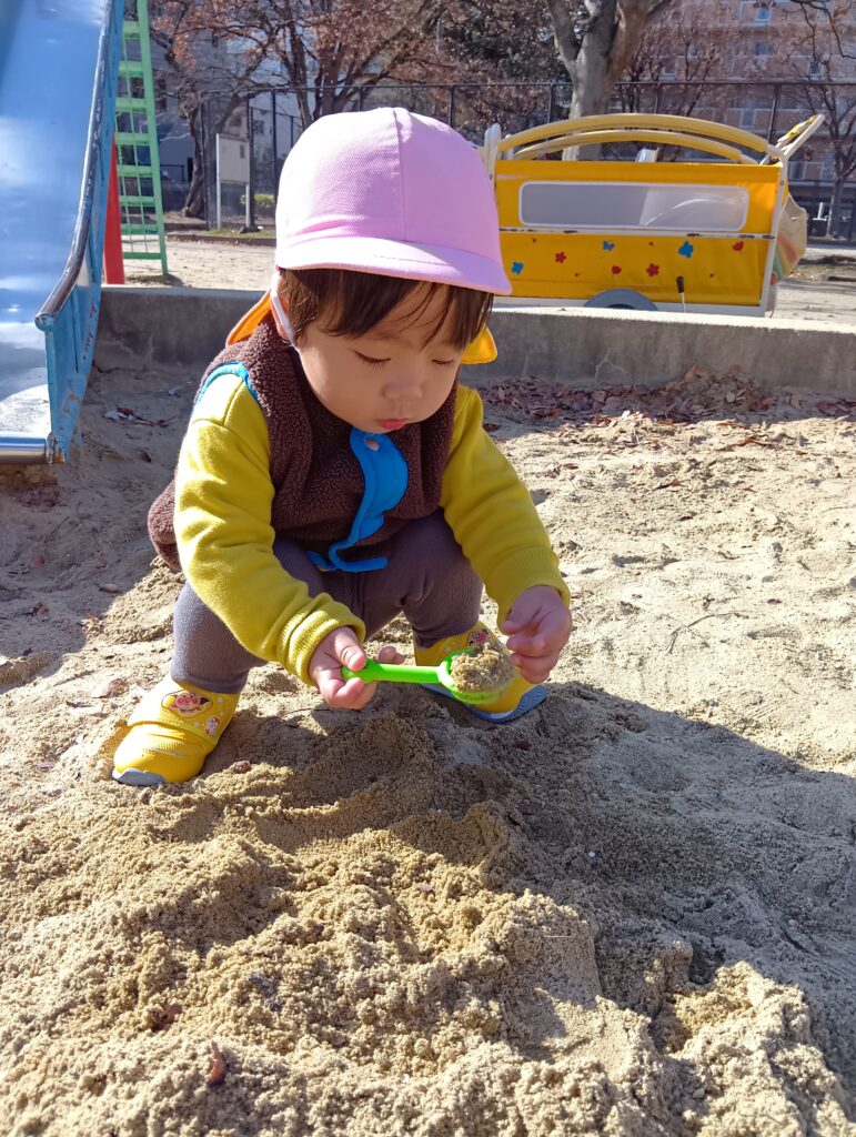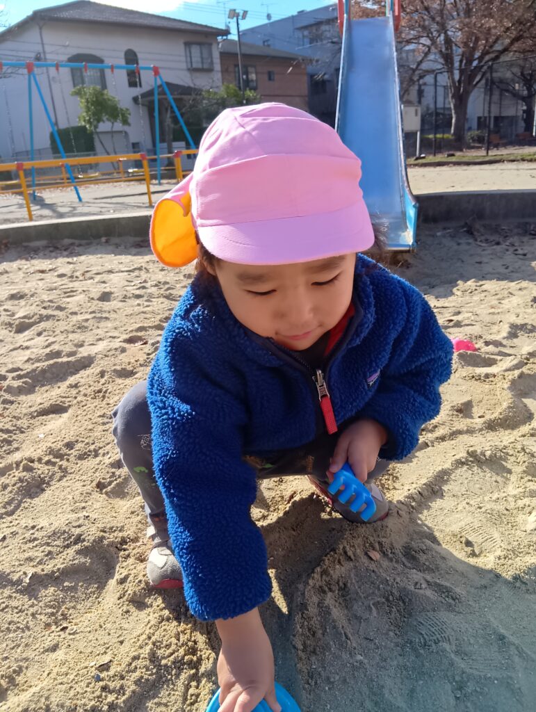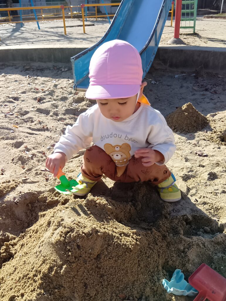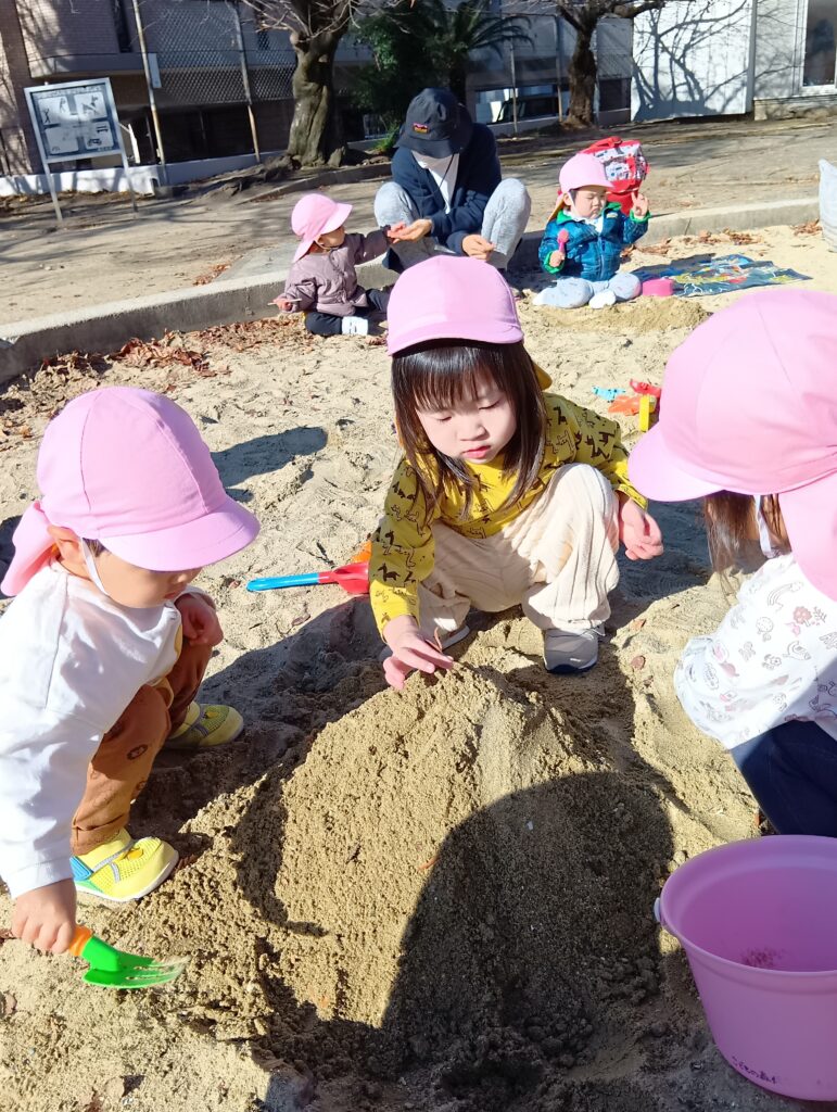 「いっしょにあーそーぼー」と言ってお友達とお山作りをしたり穴を掘ったりとても楽しんでいました✨️