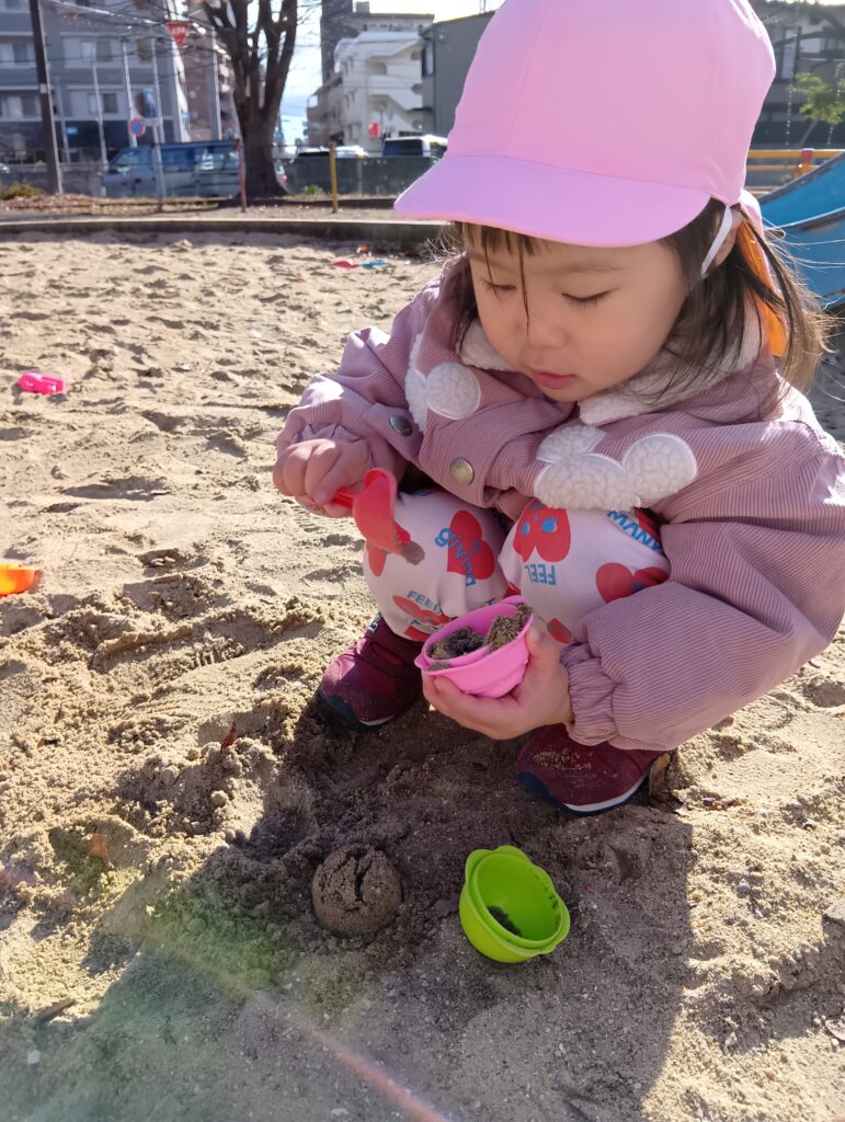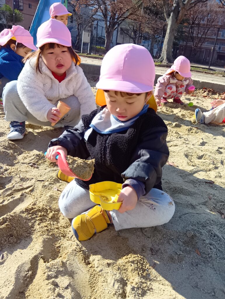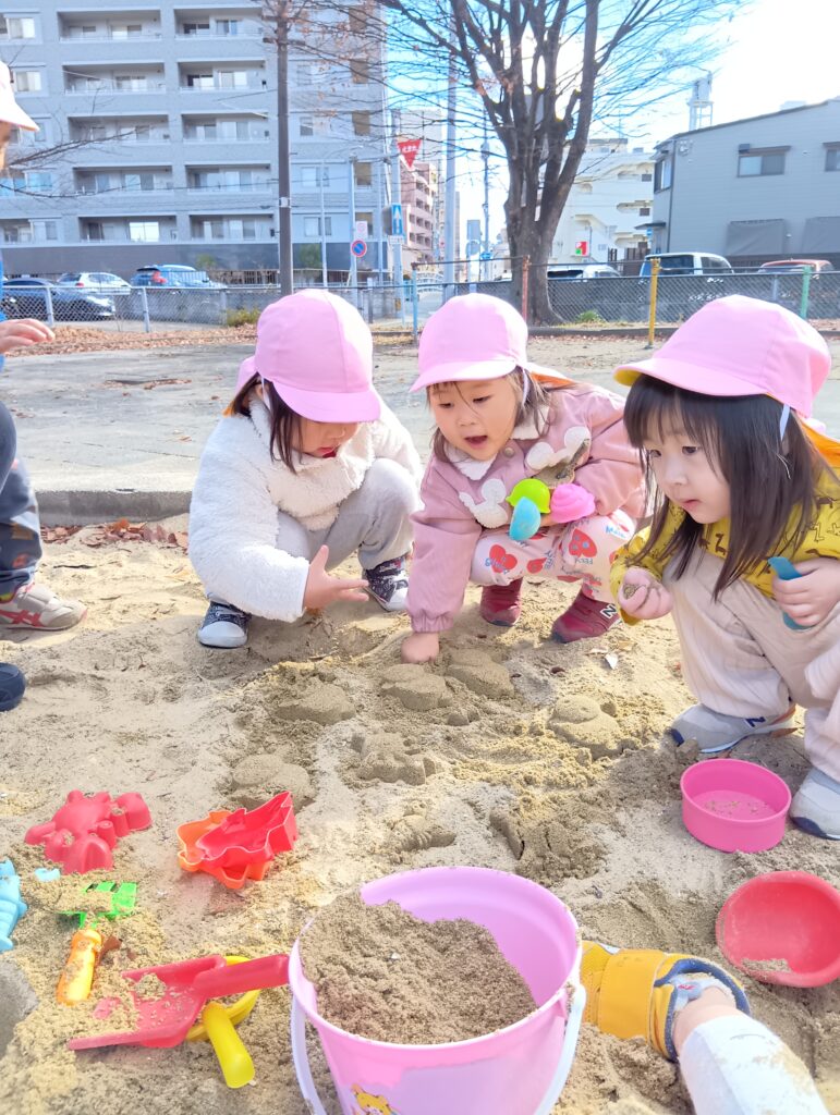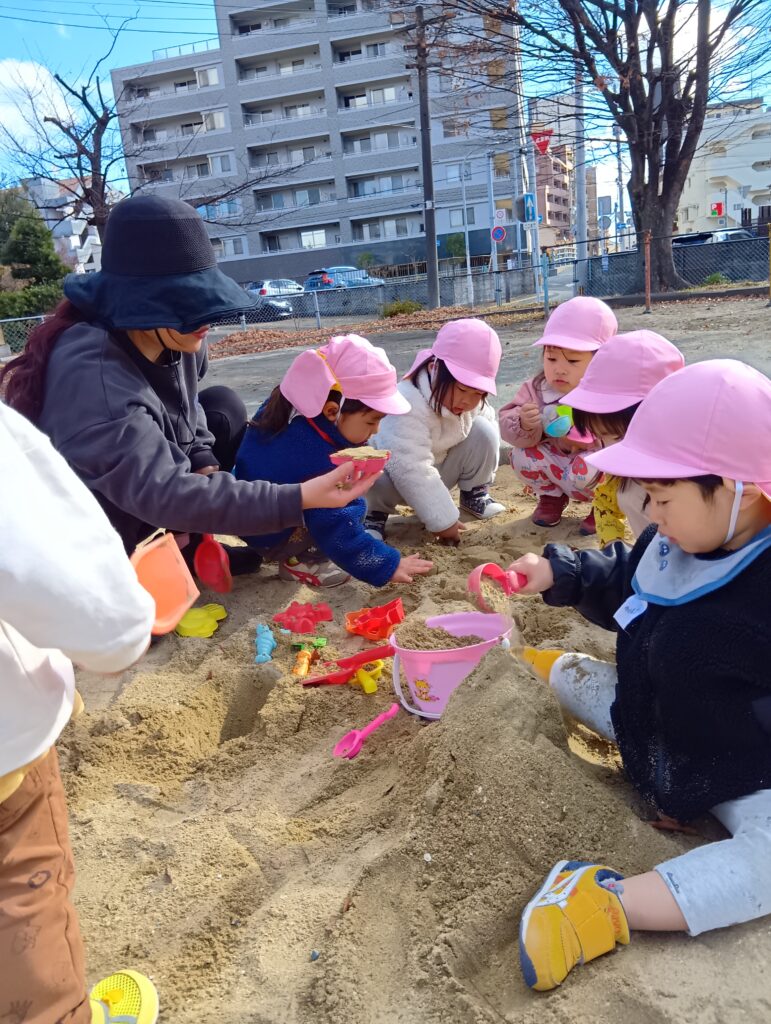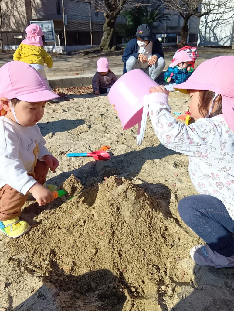 「いっしょにあーそーぼー」と言ってお友達とお山作りをしたり穴を掘ったりとても楽しんでいました✨️