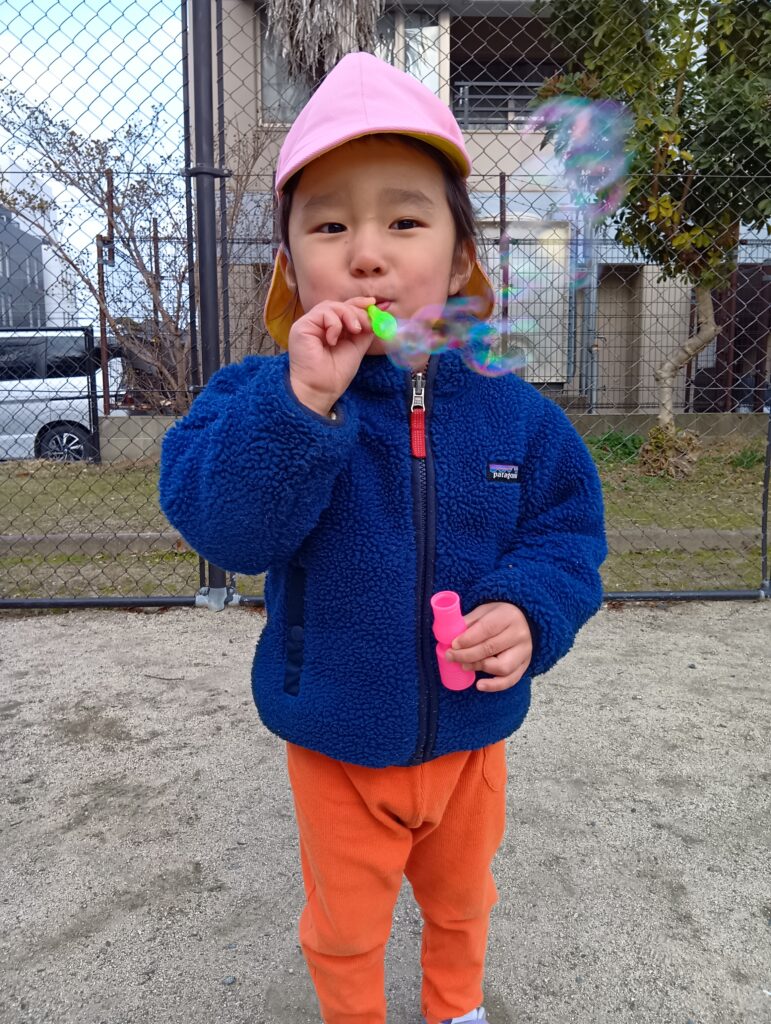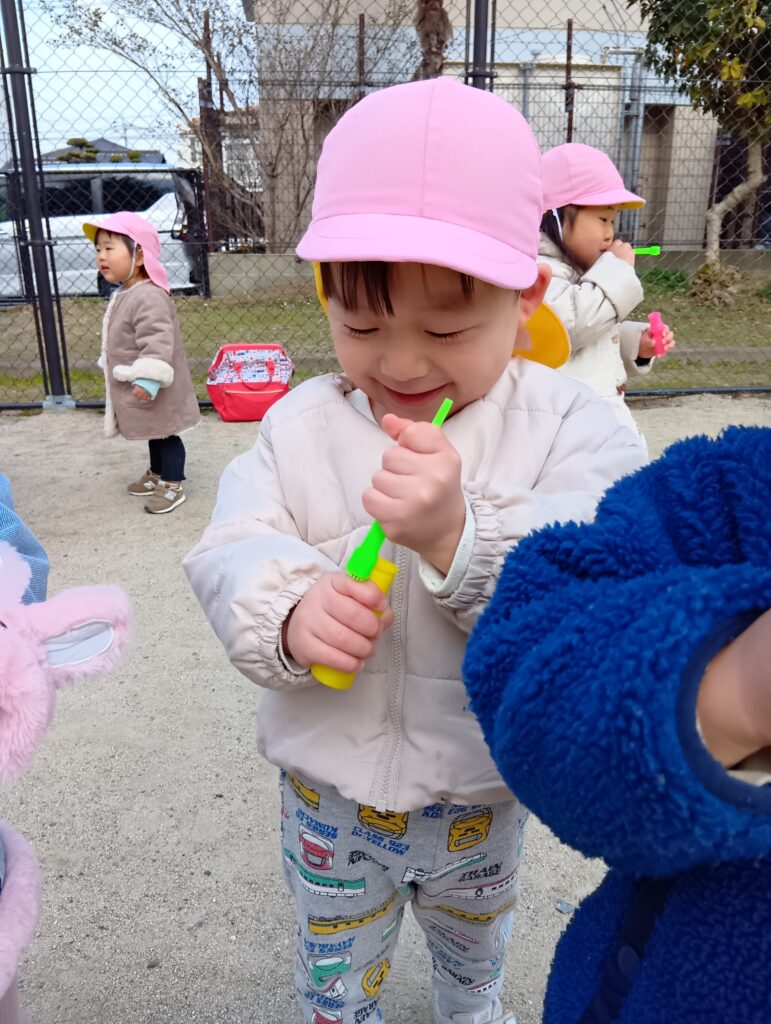 「ふーっ」と吹くのもとっても上手です✨️風で飛んでいくしゃぼん玉を見てみんな大喜びしていました😊♪