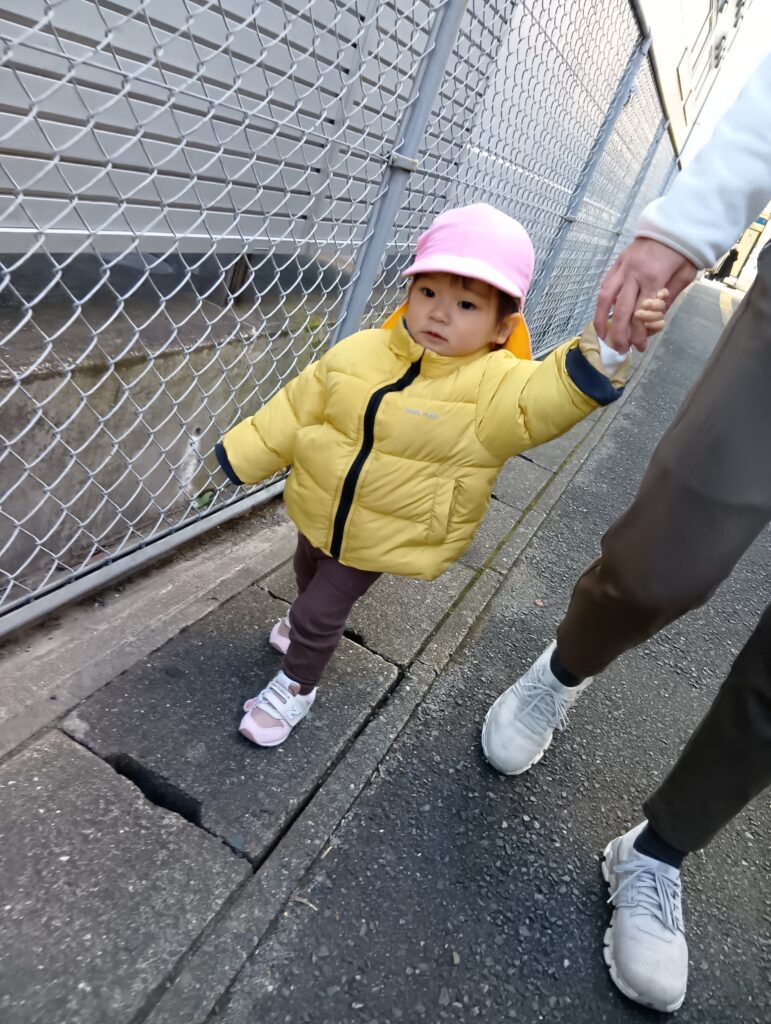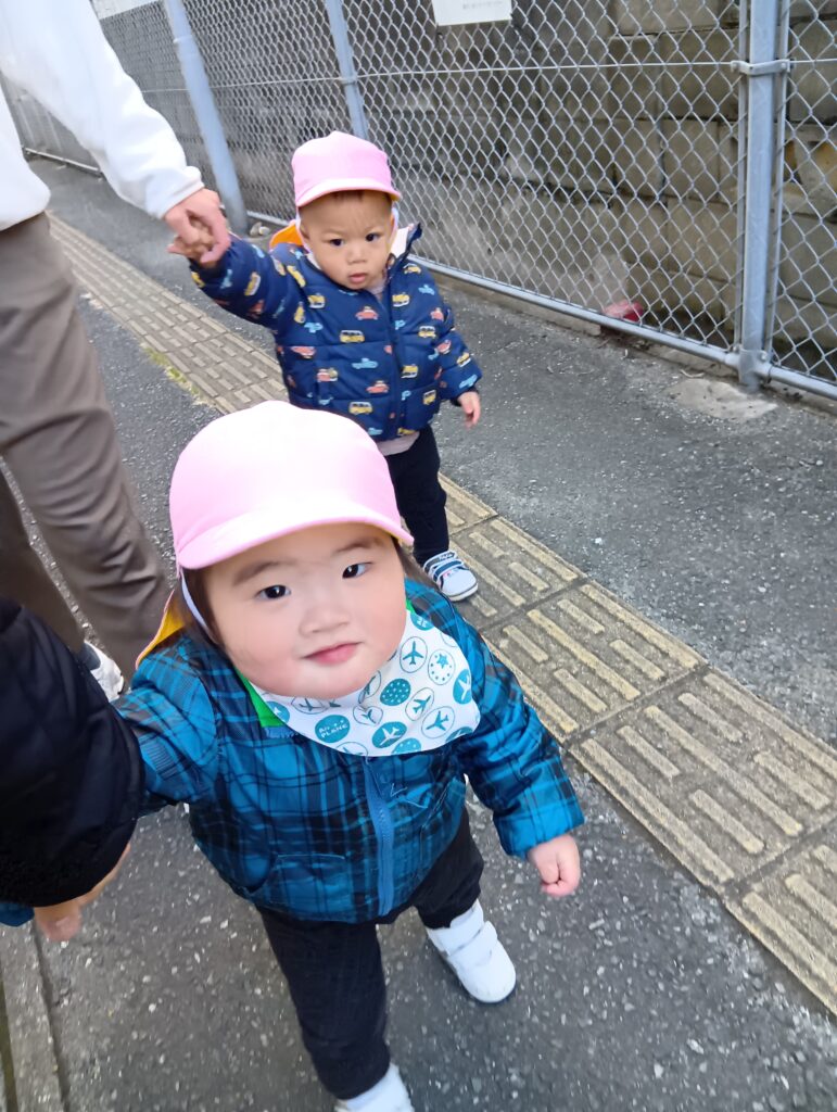 0歳児さんは少しだけお散歩に行きました♪保育者と手をつなぎながら自分で歩きました😊とっても上手に歩いていましたよ✨️