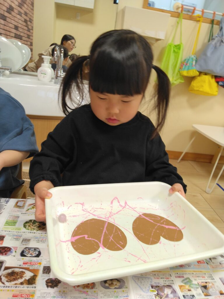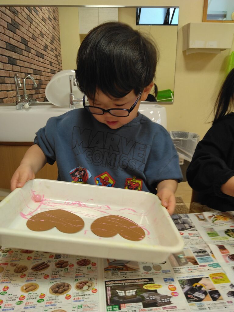 バレンタイン制作はビー玉転がしで色付けしました!