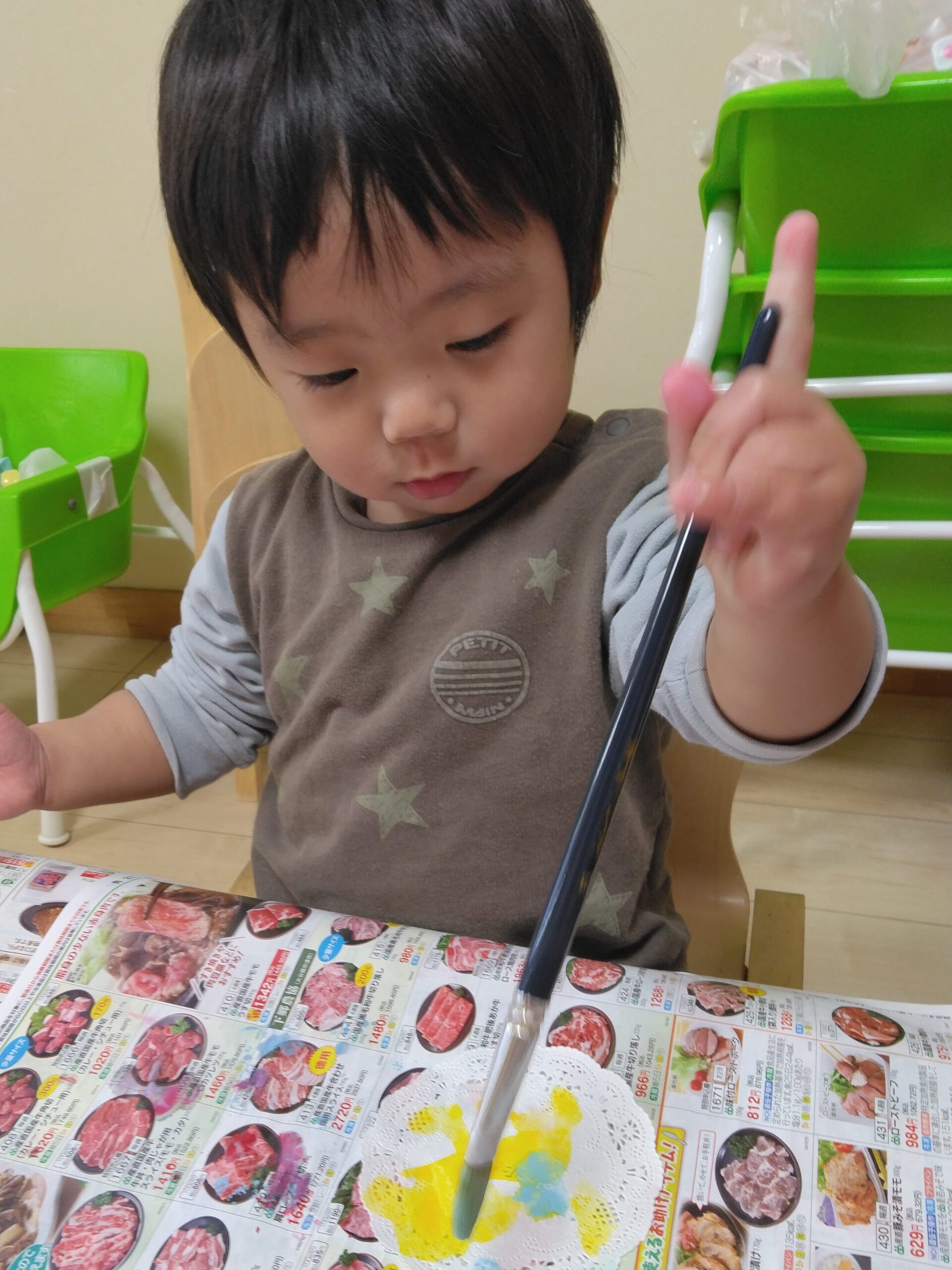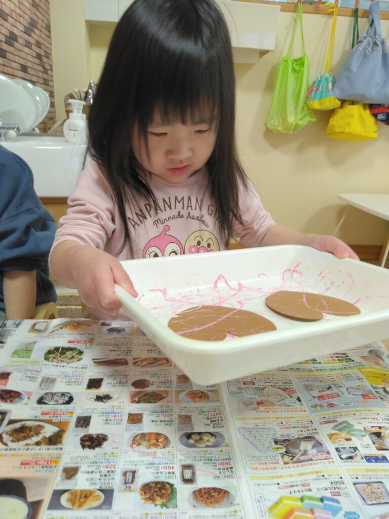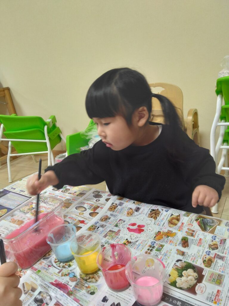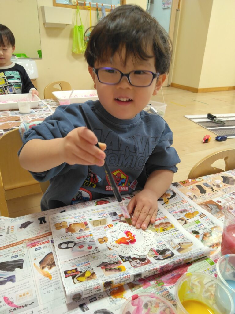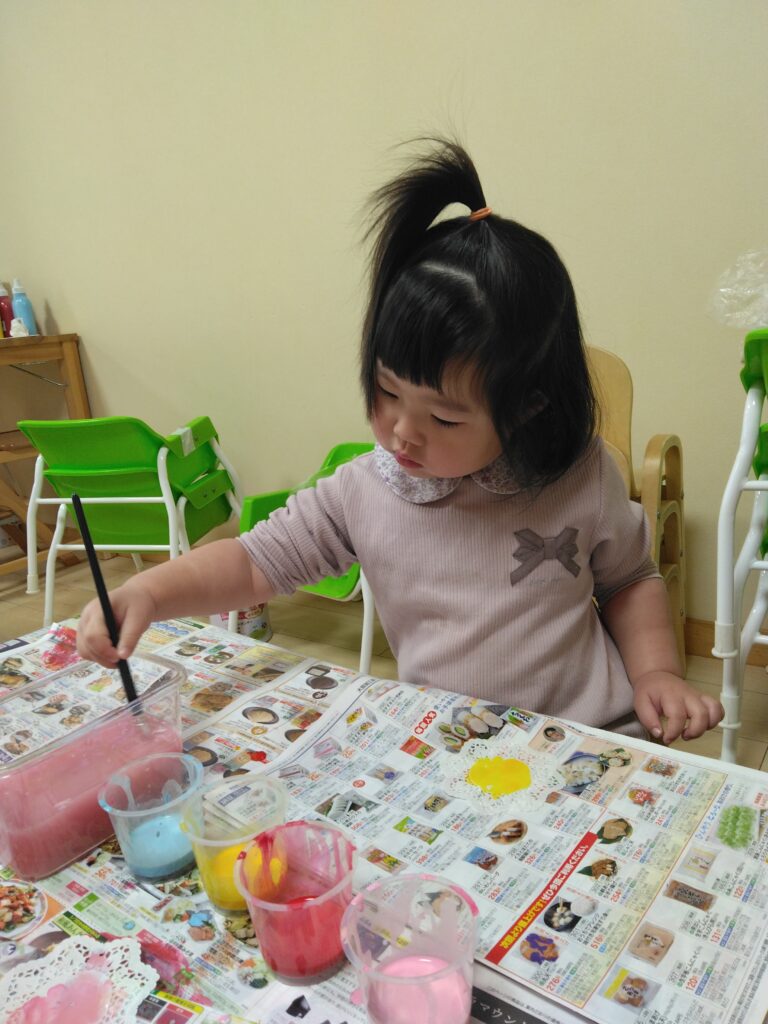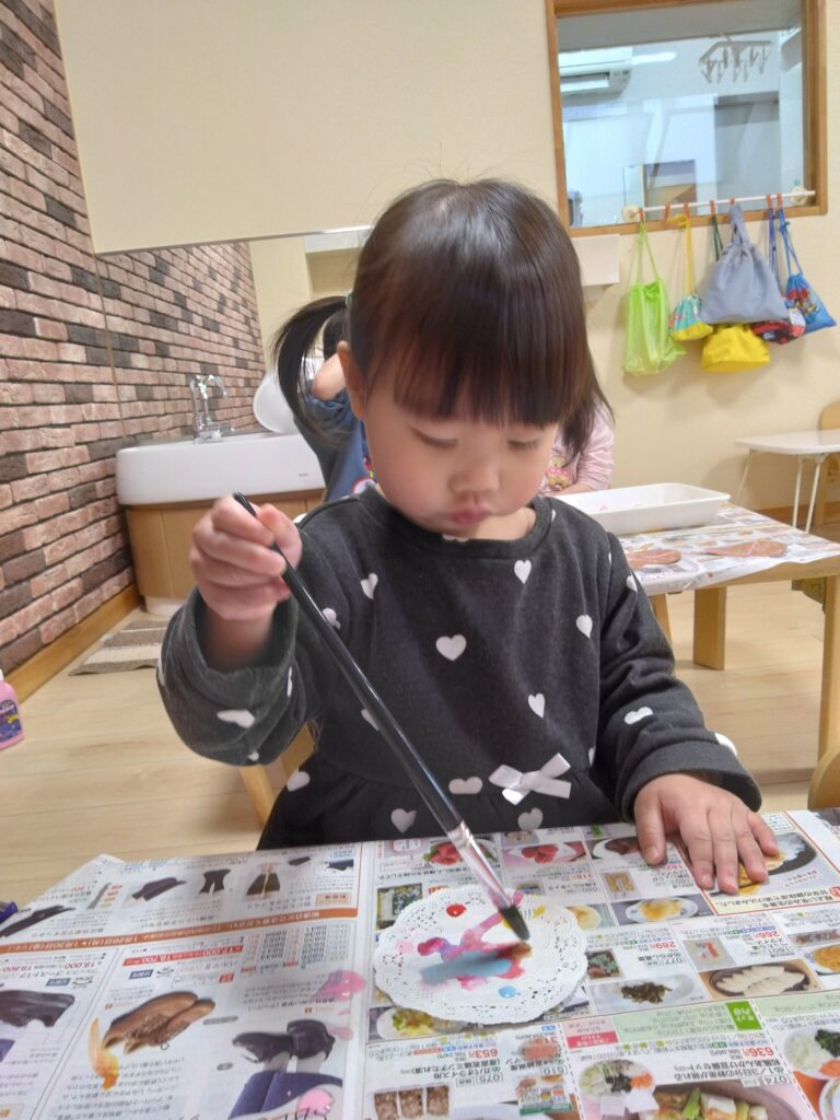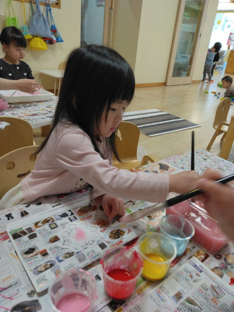 「色を変えるときは筆を洗ってね」と伝えると上手に洗っていました!