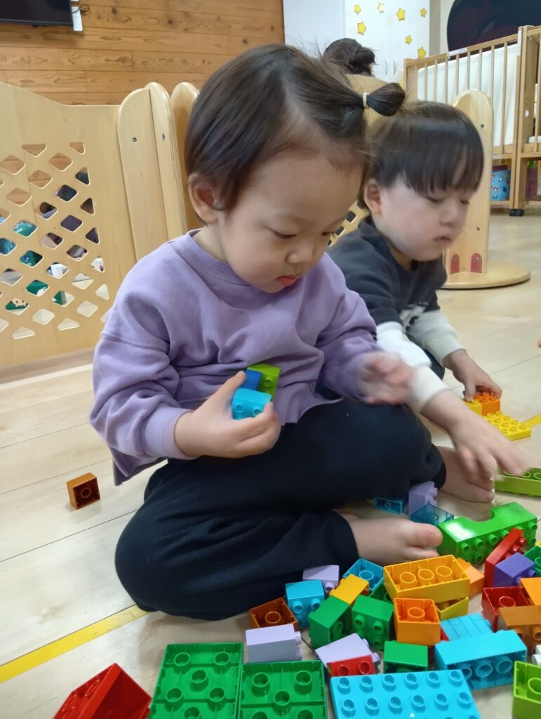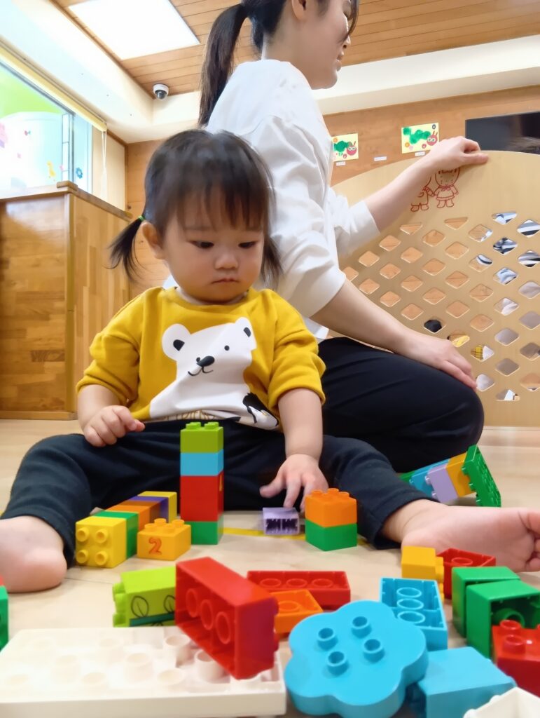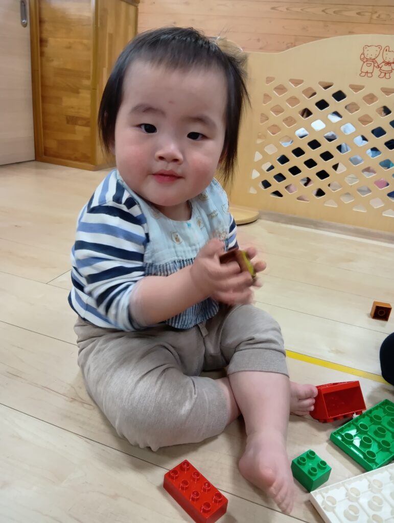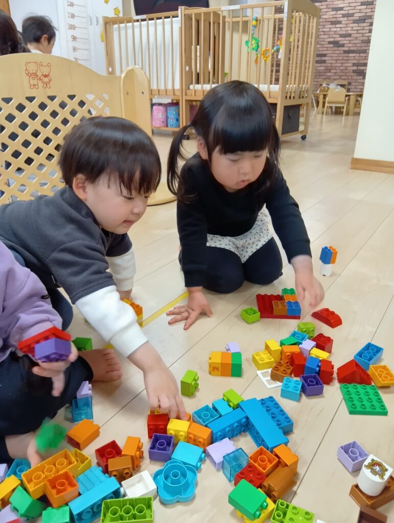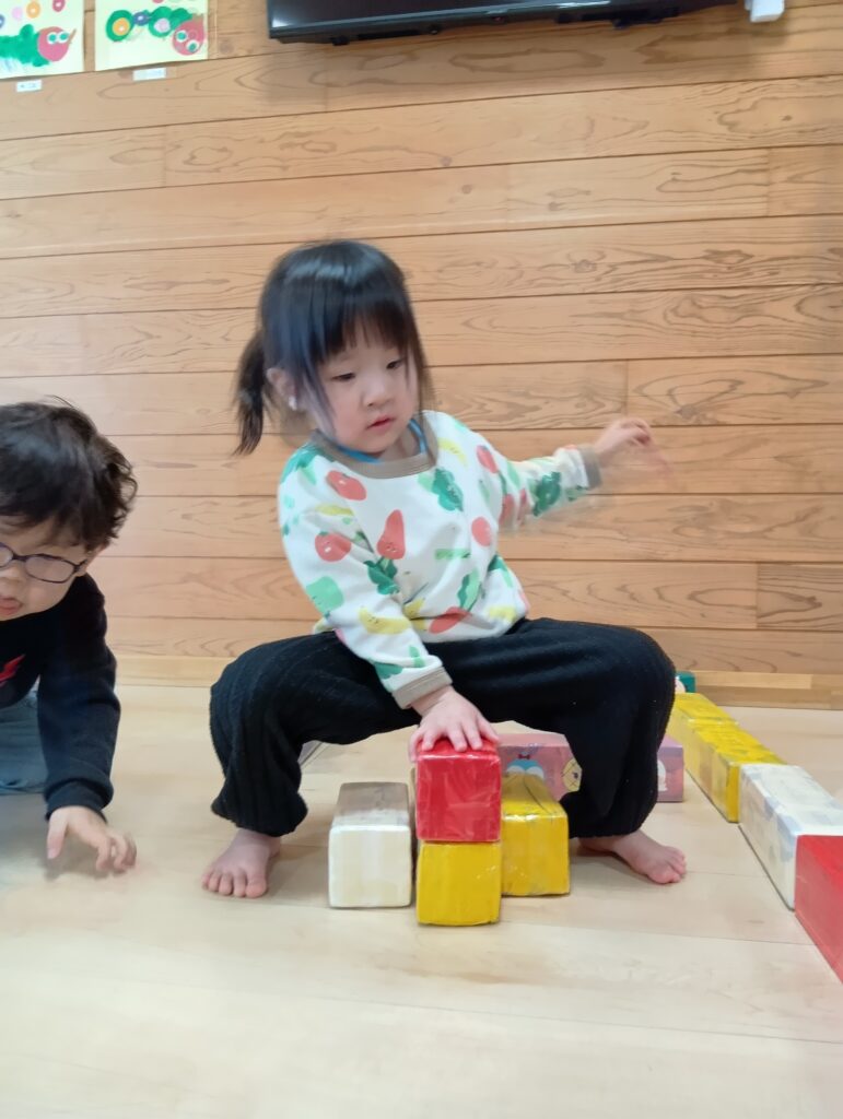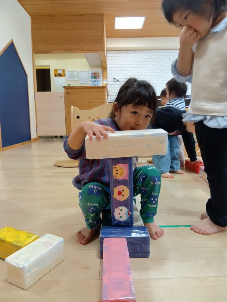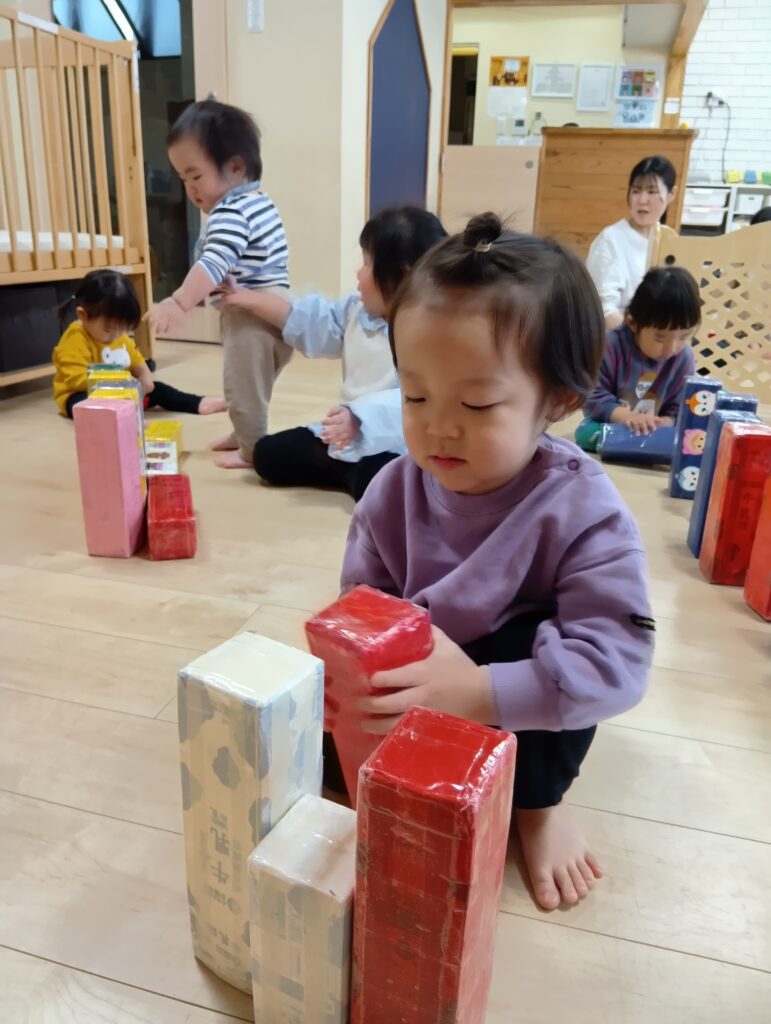 牛乳パックの積み木でドミノ倒しをしたり電車を作って座ったりとそれぞれ楽しんでいました✨️
