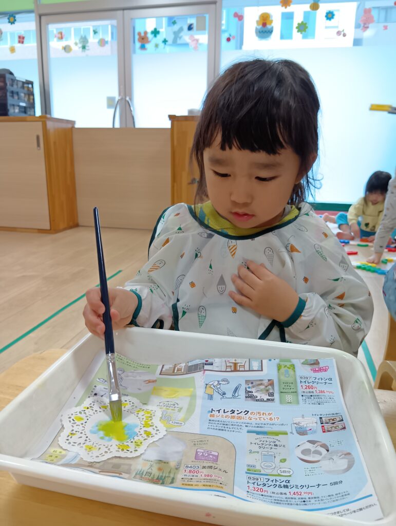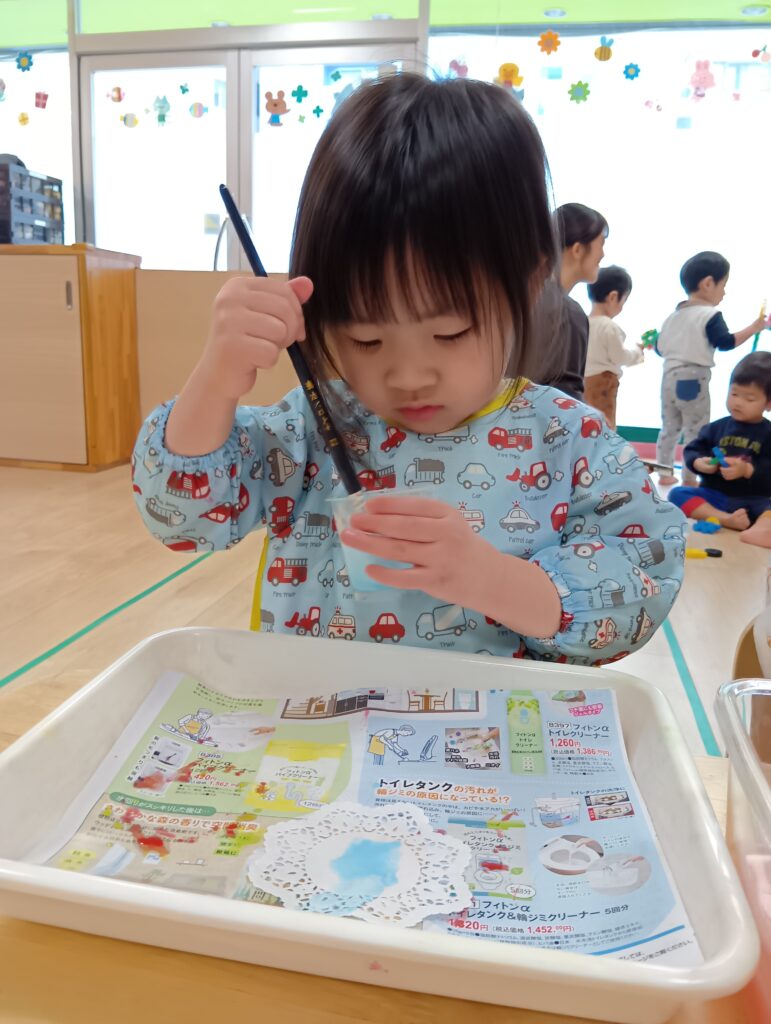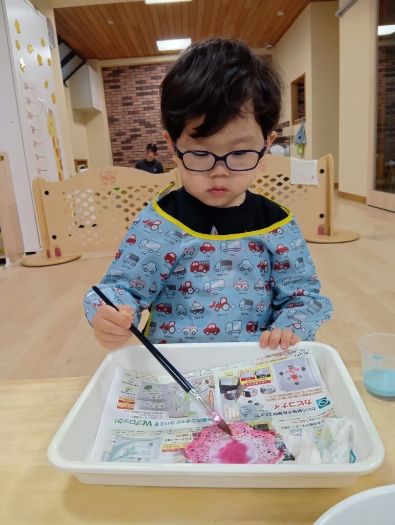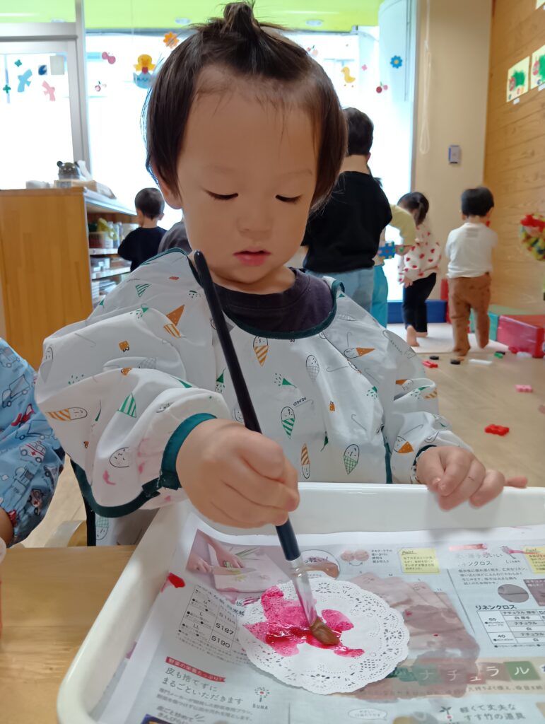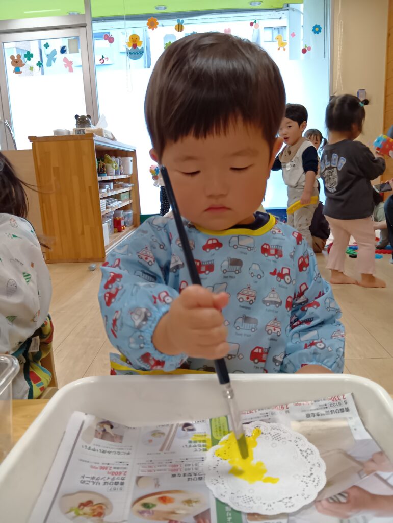 誰かが制作をしていると、「何をしてるの??」と見に来る子どもたちです🖌️「したい!」「もう一回!」と言い、筆で色を塗る感触や色が混ざる様子を、見て感じて、絵の具遊びを楽しむことができました。