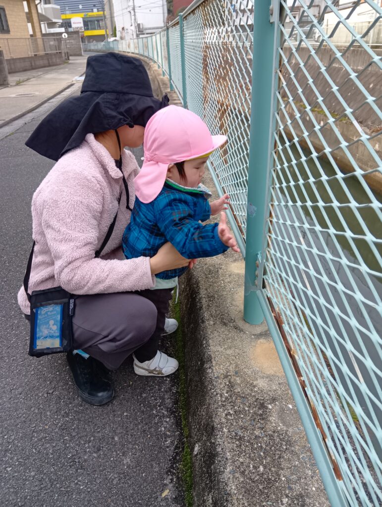 みんなが大好きなカモ。今日はいませんでしたが魚はいました🐟️「向こうに行ったよ」「みんなで追いかけようよ」と保育者や友達と話す子どもたち。私たちも、子どもたちと話すのがますます楽しくなってきました⭐️