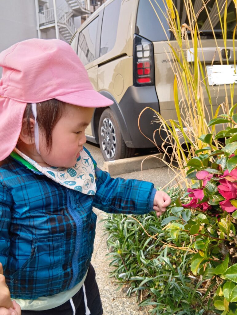 0歳児さんも保育者と手をつないでお散歩。気になるものがある時には、ちょっと立ち止まって観察しています👀子どもの「ちょっと気になる!」を大切にしていきたいですね🤩