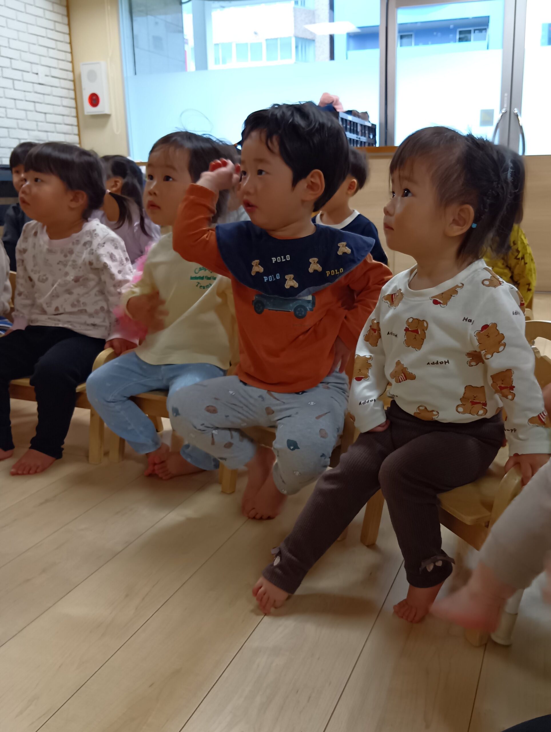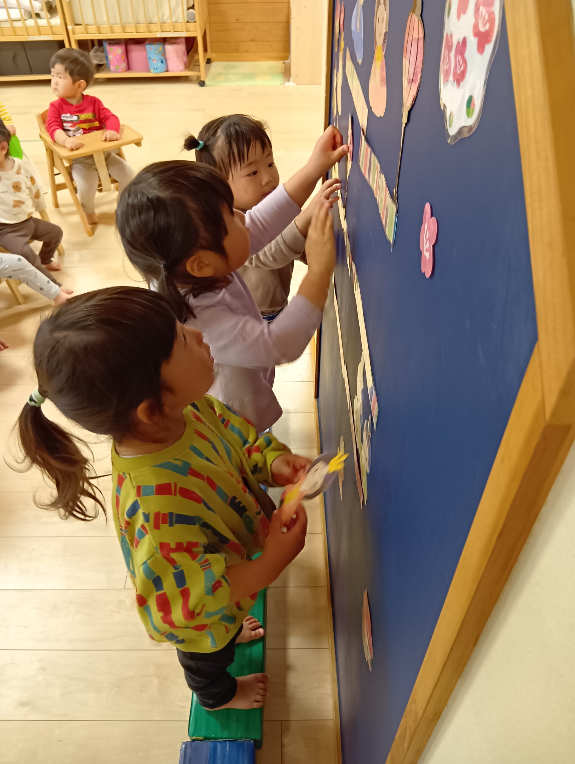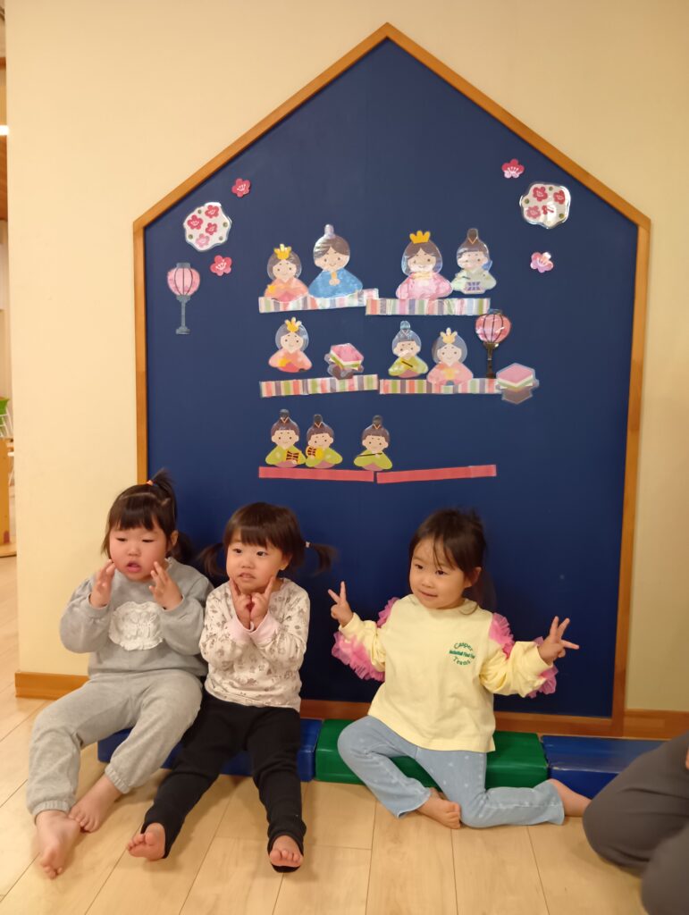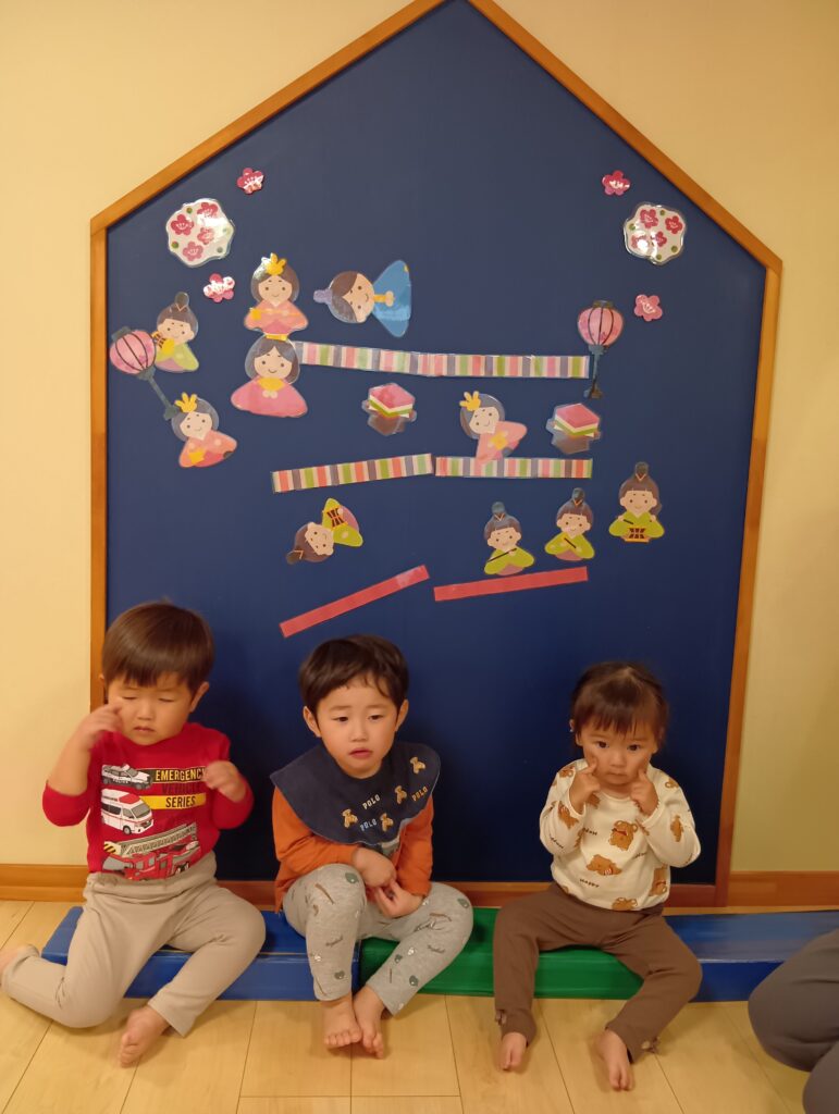 一段目はお雛様とお内裏様、二段目は三人官女、一番下は五人囃子、などと名前を伝えると興味津々に聞いていた子どもたちです🤩