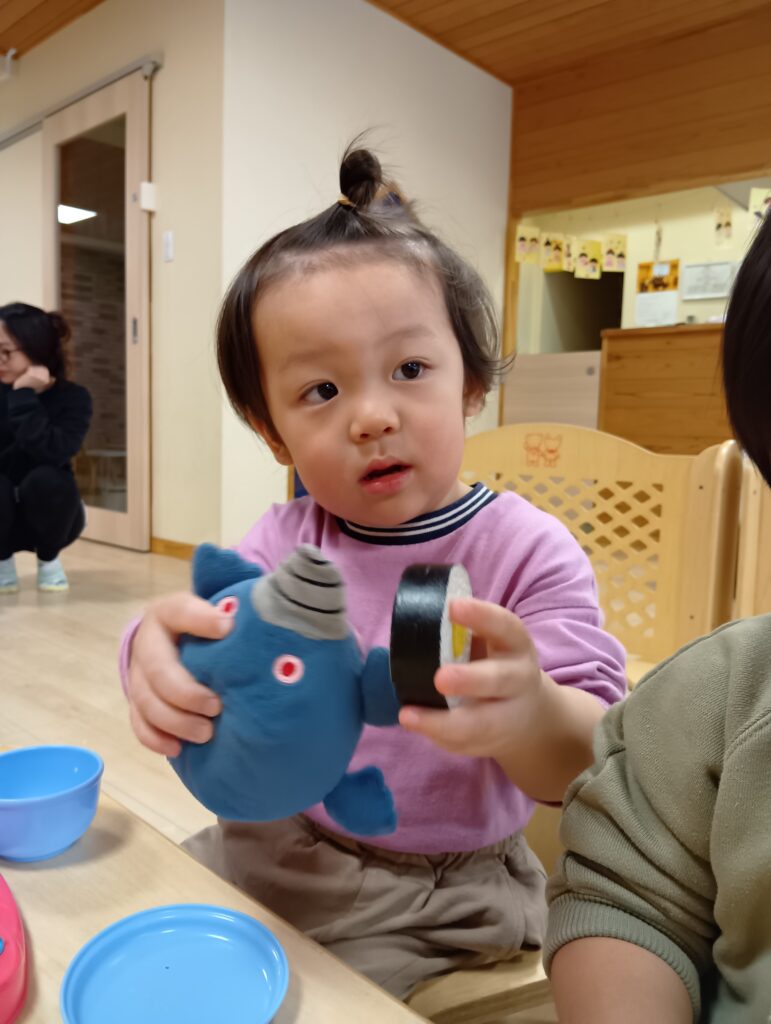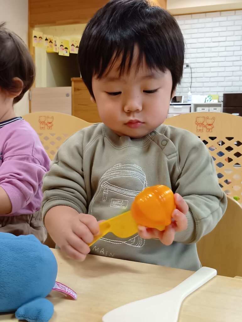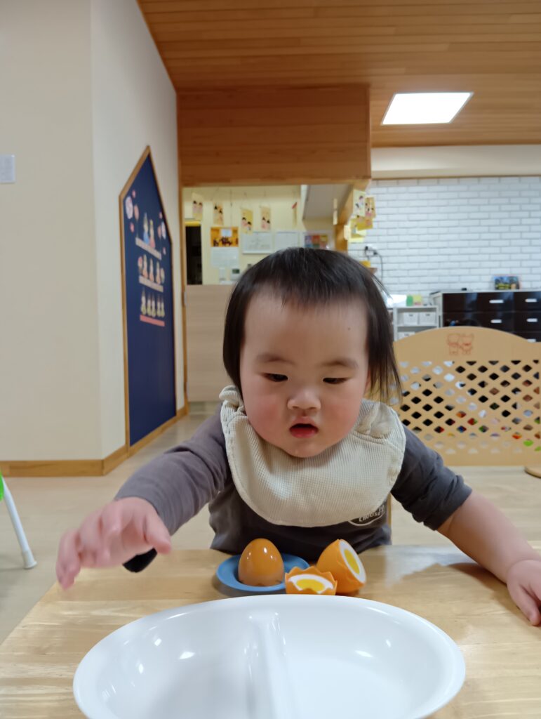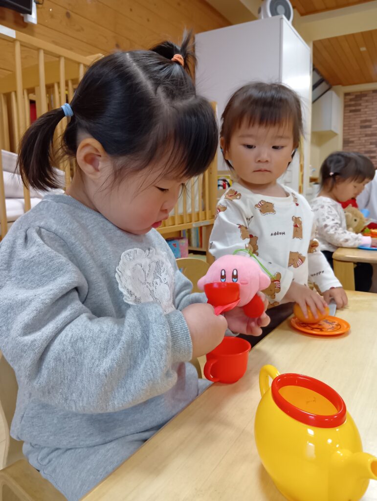 おままごとコーナーではぬいぐるみに食べさせてあげたり、