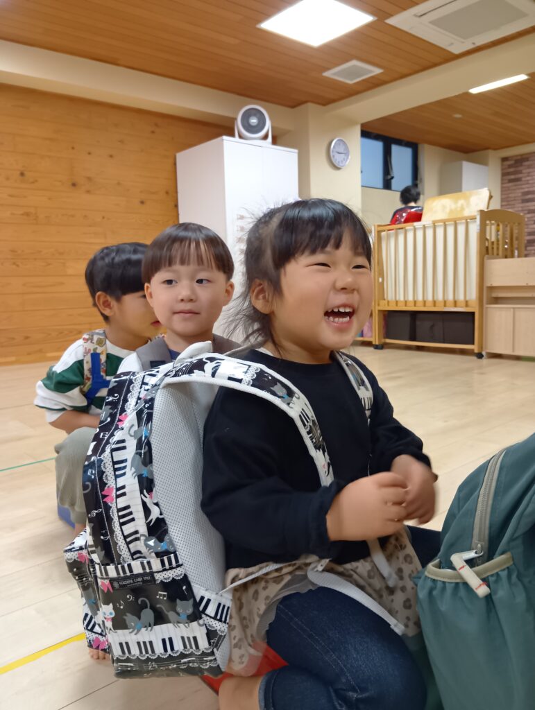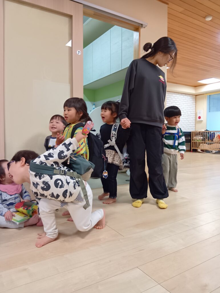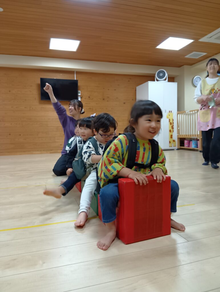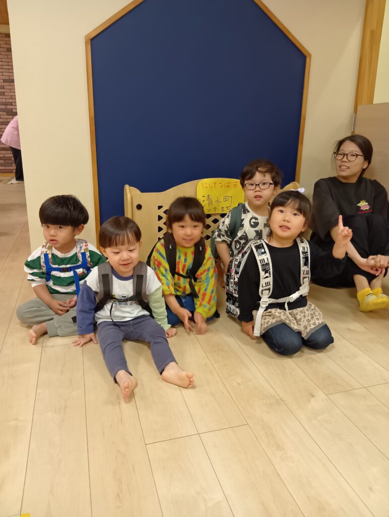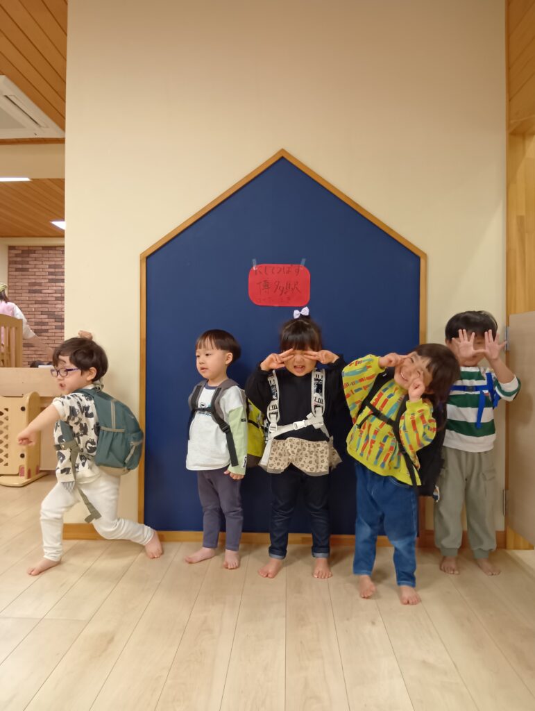 今日は生憎の雨☔でも子どもたちはとてもワクワクした表情です🤗なんてったって今日は園内遠足の日!保育室でバスごっこをして博多駅に出発です🚌
